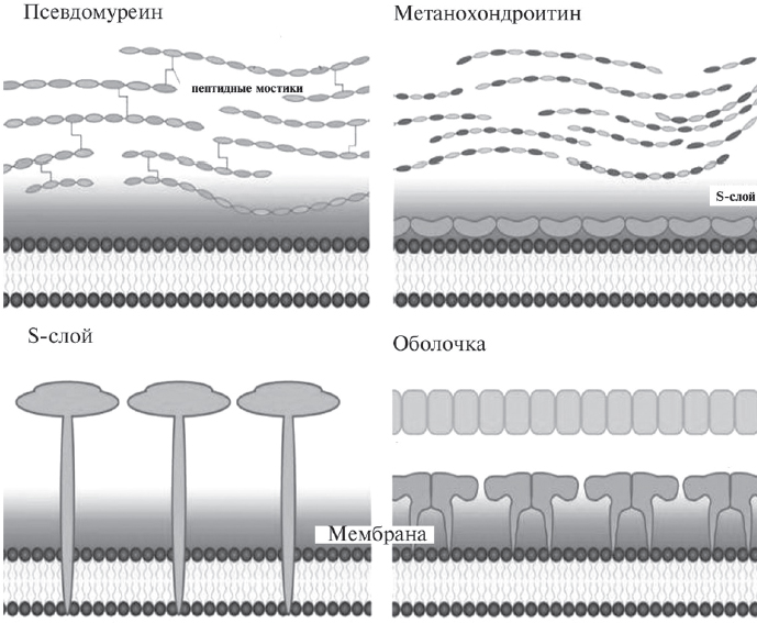 Рис. 3. Разнообразие структуры надмембранных образований у архей [15]