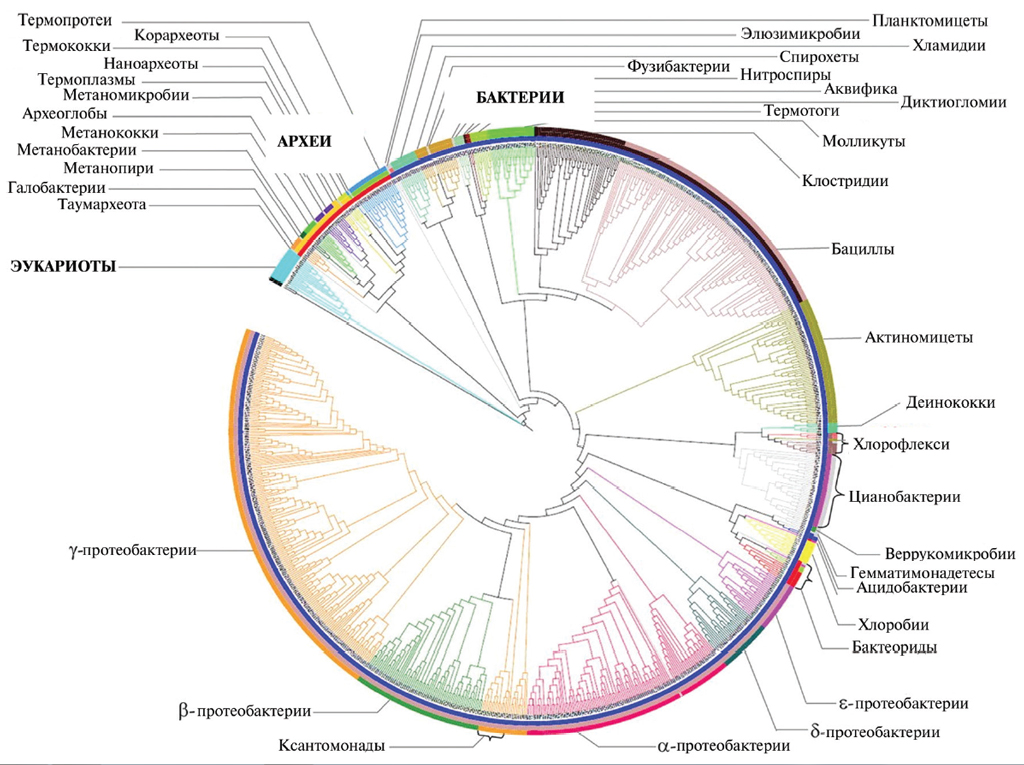 Рис. 4. Филогенетические отношения между основными группами прокариот, основанные на сравнительном изучении полного протеома модельных организмов, и положение эукариот на глобальном древе жизни [16]
