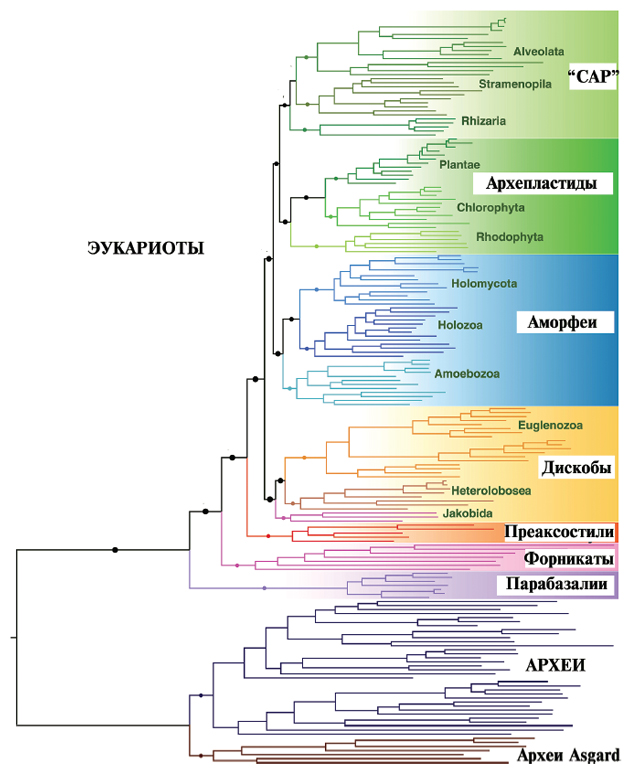 Нуклеоцитоплазма эукариот представляет филогенетическую линию, сестринскую археям [16] (рис. 4). Определяющими чертами эукариотной клетки являются большой размер в сочетании с наличием сложной эндомембранной системы, которая включает ядро, наделенное ядерными порами, и аппарат сплайсинга, связанный с ядерно-цитоплазматическим транспортом. Эукариотическая клеточная организация неустойчива без преобразующих энергию органелл, таких как митохондрии [17]. В настоящее время хорошо разработаны сценарии происхождения эндомембран, ядра и сплайсосом-опосредованного сплайсинга в результате эндосимбиоза [18–20]. Молекулярные данные полностью подтвердили теорию серийного симбиогенеза, согласно которой происхождение эукариотной организации связано с приобретением архееподобной клеткой протеобактериеподобной митохондрии, а также автотрофных эндосимбионтов в различных «растительных» линиях эволюции [8].