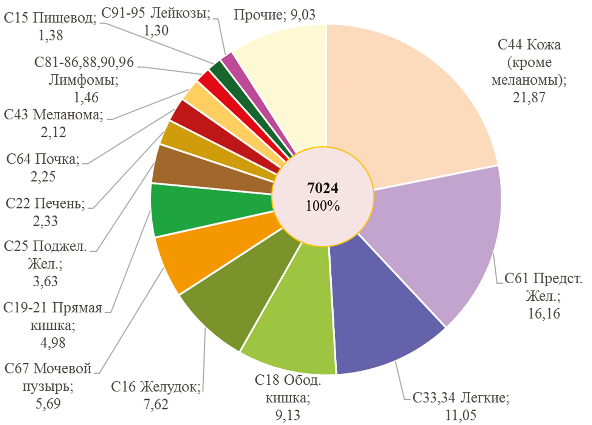 В 2021 году в России было учтено 109 405 больных ЗНО старческого возраста (18,85% от всех больных). Пандемия коронавирусной инфекции нанесла значительный урон возможности посетить ЛПУ и стационары онкологической службы. До врачей не дошло >20% больных [13]. В возрастной группе 75–79 лет к онкологам не пришло 29,11% обычно поступающих больных, которые не обратились к специалистам и в 2021 году. Вместе с тем следует отметить, что с 2000 по 2021 год число больных ЗНО старческого возраста увеличилось на 49,16%, а в возрастной группе 80–84 года практически утроилось.