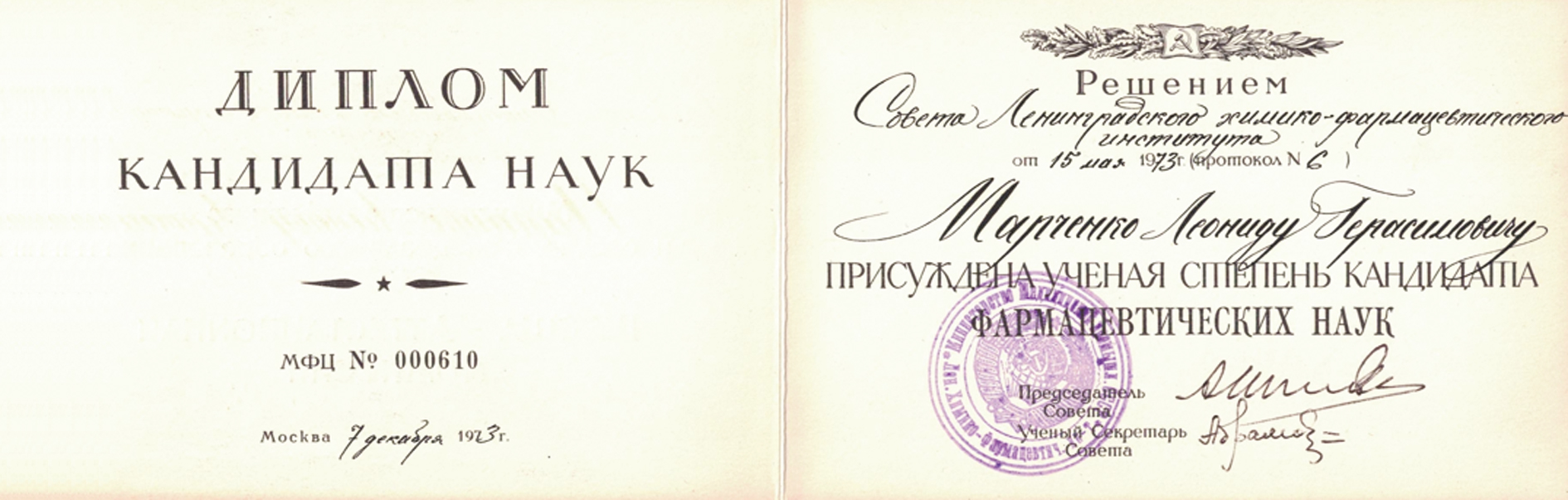 Fig. 3. Diploma of Candidate of Pharmaceutical Sciences L.G. Marchenko, 1973