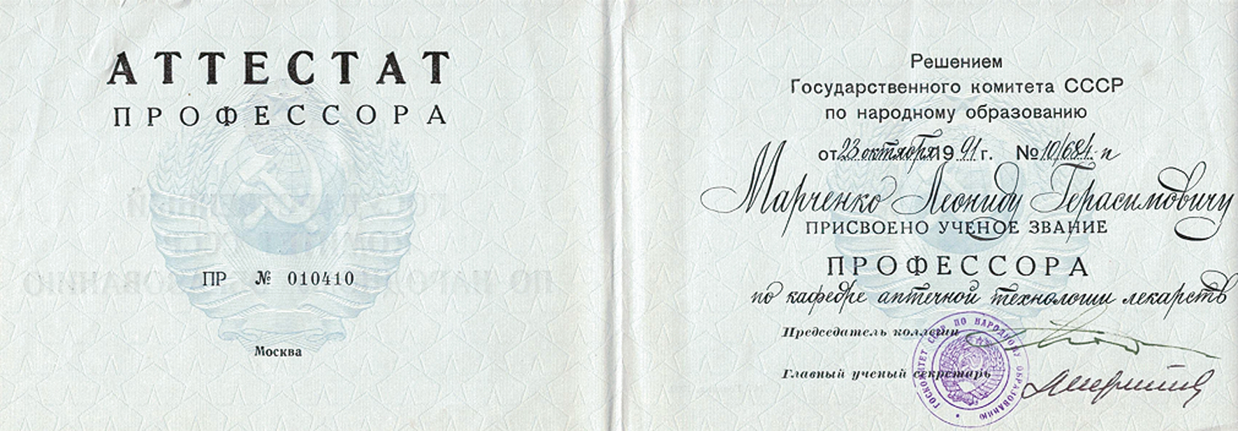 Рис. 8. Аттестат профессора Л. Г. Марченко по кафедре аптечной технологии лекарств, 1991 год