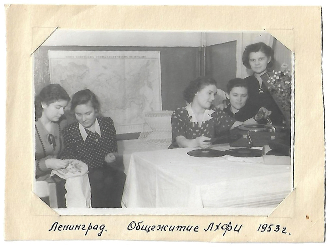 Рис. 4. 5-й курс Технологического факультета ЛХФИ, комната общежития № 30 учебная гр. 180, 1953 год (слева на право: Лина Мезенцева, Луиза Коковнина, Елена Розова, Евдокия Изгорьева, Сусанна Минина)