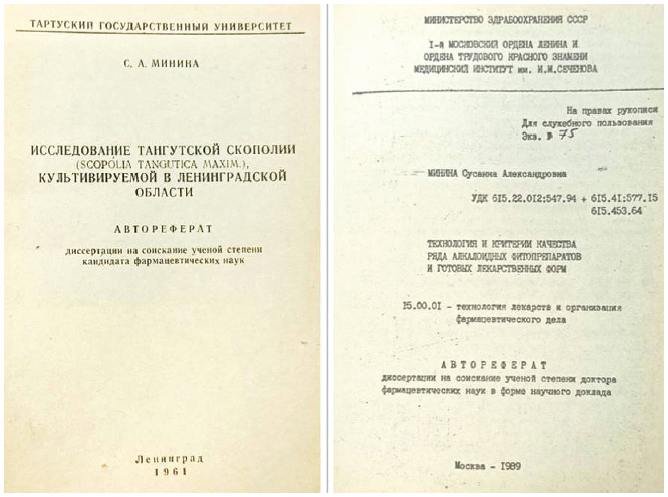 Рис. 6. Титульные листы авторефератов Мининой С. А. на соискание степеней кандидата и доктора фармацевтических наук