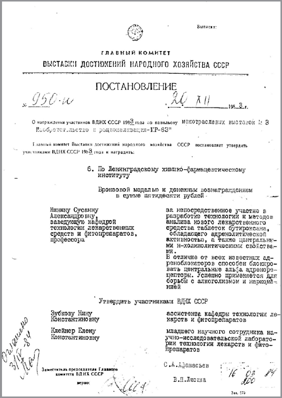 Деятельность Сусанны Александровны Мининой отмечена правительственными наградами: за высокие достижения в производстве, научно-исследовательской работы награждена Орденом «Знак почета» в том числе знаками отличия «Отличник здравоохранения» и «Отличник медицинской и микробиологической промышленности СССР». С. А. Минина награждена дипломом и золотой почетной медалью Академии естественных наук «За практический вклад в укрепление здоровья нации». Работы Сусанны Александровны отмечены бронзовыми наградами ВДНХ СССР (рис. 11)