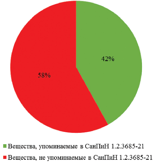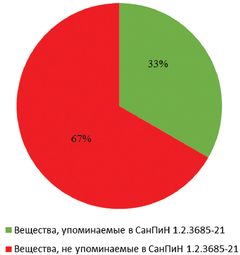 Как видно из данных диаграммы (рис. 2) и таблицы 2, количество веществ, которые представляют опасность для окружающей среды [26], но которые не регламентируются СанПиН 1.2.3685-21 в два раза превышает, число соединений, подлежащих контролю в соответствии с этим нормативным актом.