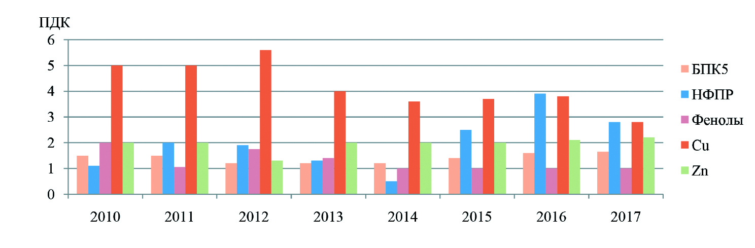 Из диаграммы видно, что в 2015−2017 гг., по сравнению с предыдущими годами, возрос до 3-4 ПДК средний уровень загрязненности воды нефтепродуктами. Среднегодовые концентрации остальных характерных загрязняющих веществ, в основном, колеблются около двух ПДК, а соединения меди достигают трех ПДК.