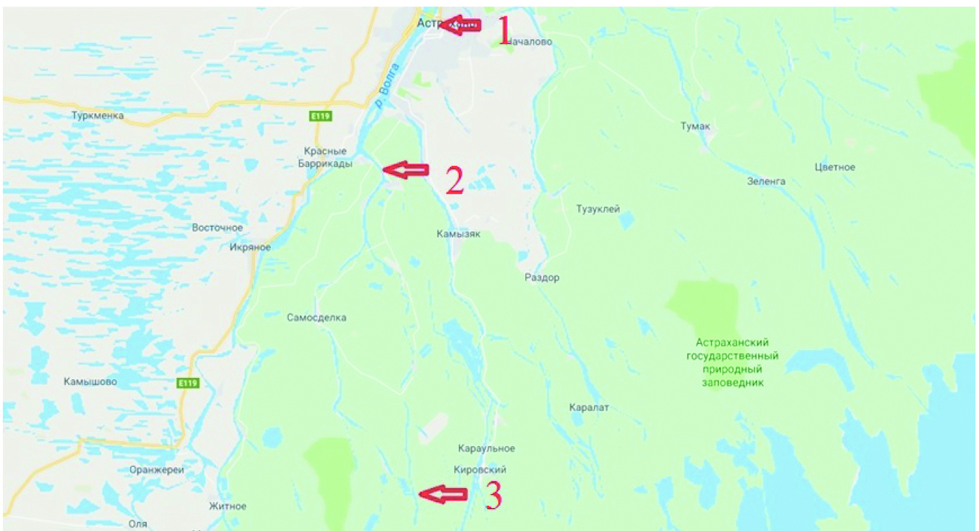 Рис. 2. Станции отбора тест-организмов: 1 – Рукав Городской, 2 – Проток Малый, 3 – река Гандурино