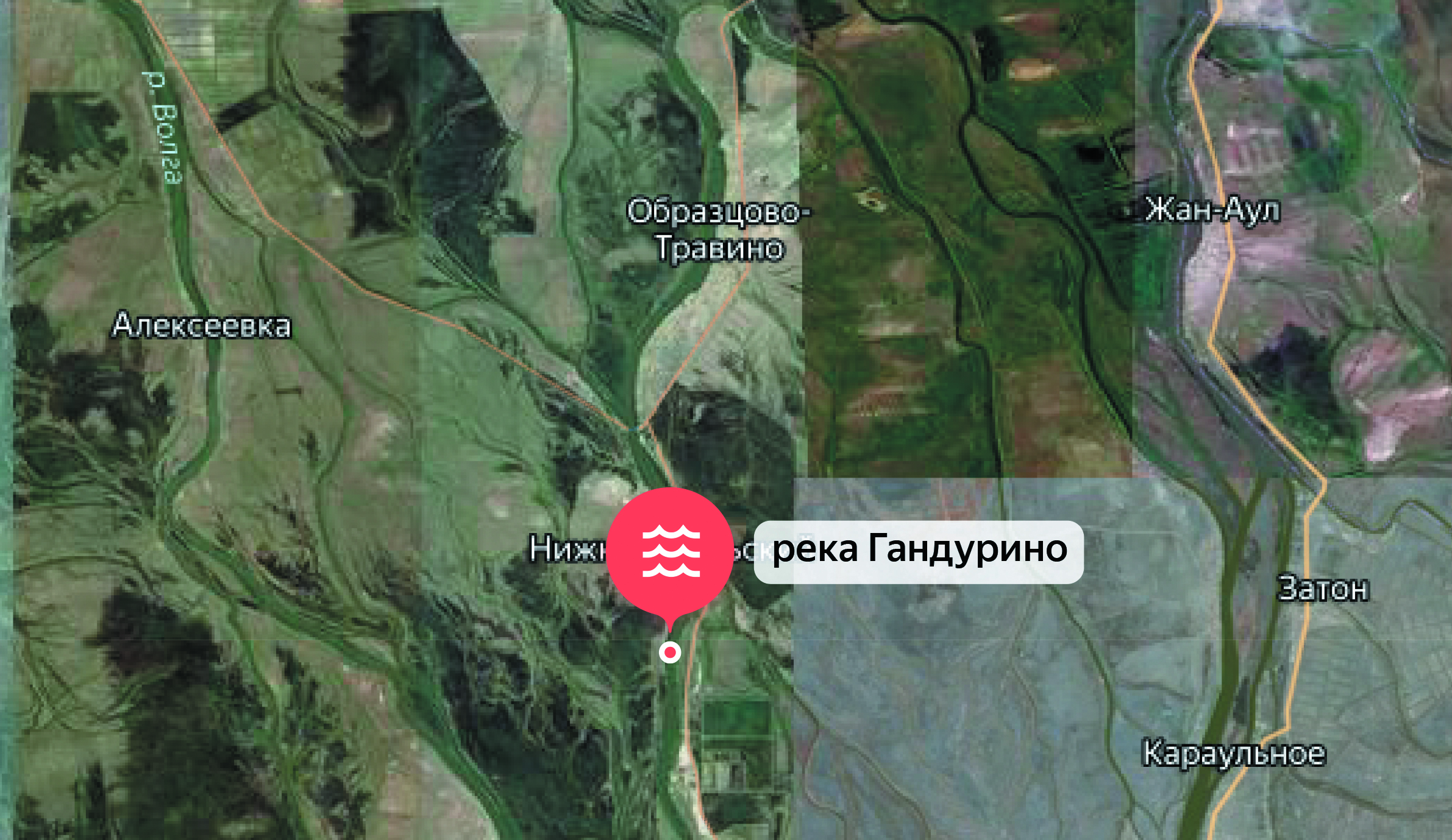 Fig. 6. Gandurino River (Kamyzyaksky District). Red marker indicates the station for the selection of mussels)