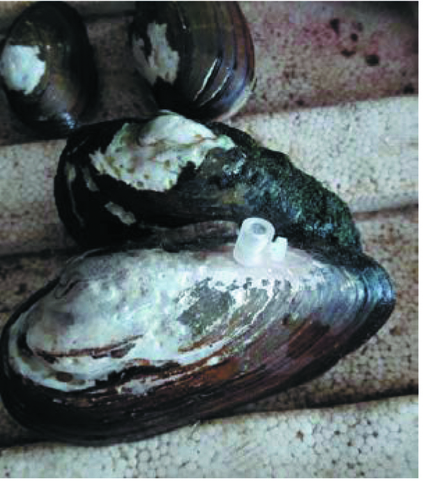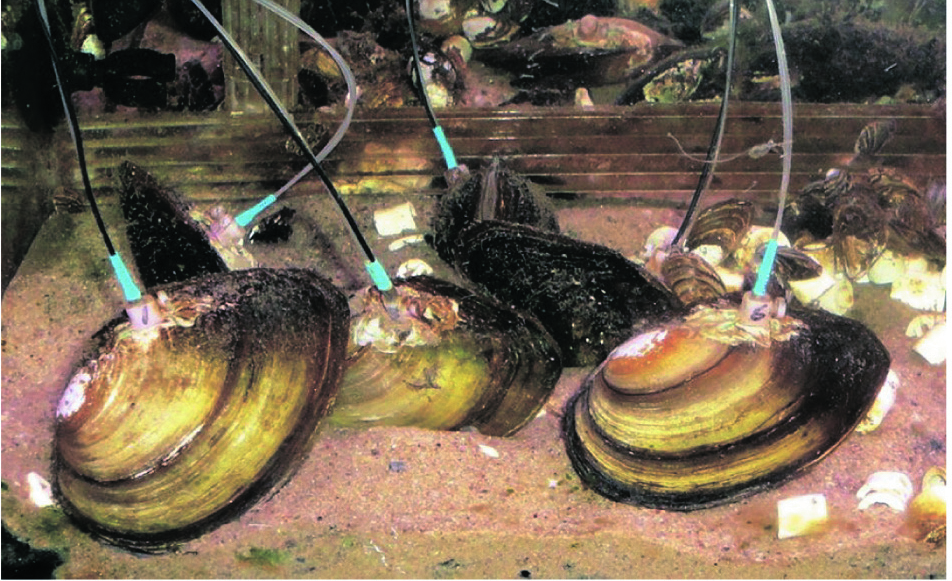 Fig. 8. Mussels with fiber-optic probes attached to the valves for non-invasive recording of the cardiac activity