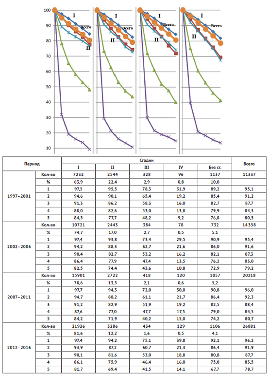 На рисунке 1 с таблицей представлены данные выживаемости больных ЗНО кожи (С44) в СЗФО РФ с учетом стадии заболевания. Всего отобрано для исследования 92 843 наблюдения за периоды с 1997–2001 и 2012–2016 в когорты больных, объединенных по пять лет. С каждой пятилетней когортой число больных существенно возрастало. Здесь же представлена структура больных с учетом стадии заболевания. Если данные, переданные в раковые регистры СЗФО РФ, свидетельствуют о существенном увеличении удельного веса ранних стадий с 90,6 до 94,8%, реальные расчеты (см. рис. 1) говорят о более низких величинах, хотя все показатели выживаемости больных ЗНО кожи (С44) находятся на высочайшем уровне: однолетняя выживаемость – 95–96%. Учитывая данные погодичной летальности, опубликованные в первой части настоящего исследования, необходимо обратить внимание на её специфику: резкого увеличения летальности после 6 лет наблюдения или снижения погодичной выживаемости больных, что может быть связано с особенностями биологического развития опухолей кожи и коррекции лечебной помощи больным данной группы.