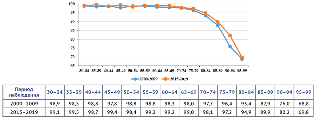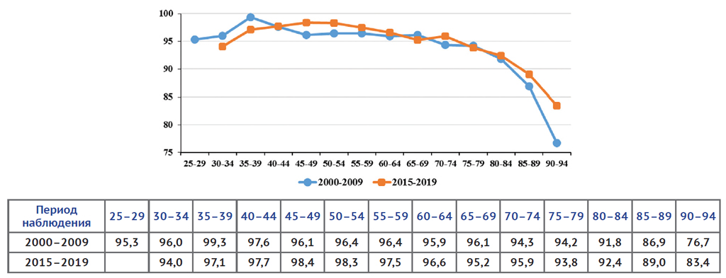 В целом динамика однолетней выживаемости положительна: однолетняя выживаемость возросла с 2000 по 2019 гг. с 95,6 до 96,2%, а пятилетняя до 2015 года практически не изменялась и составила 80,9%. Более низкие показатели пятилетней выживаемости в конце периода могут быть связаны со спецификой изменения возрастного состава населения. Что касается распределения больных по полу, учитывая особенности профессионального состава мужского населения, мы отмечаем здесь также положительную динамику однолетней наблюдаемой выживаемости, но на несколько меньших величинах 94,4 и 94,8%, пятилетняя находилась в пределах 76,0%. У женщин однолетняя выживаемость достигла 96,9%, пятилетняя – 83,3%. Относительная выживаемость была на 1–2% выше, пятилетняя – на 5–7%.
