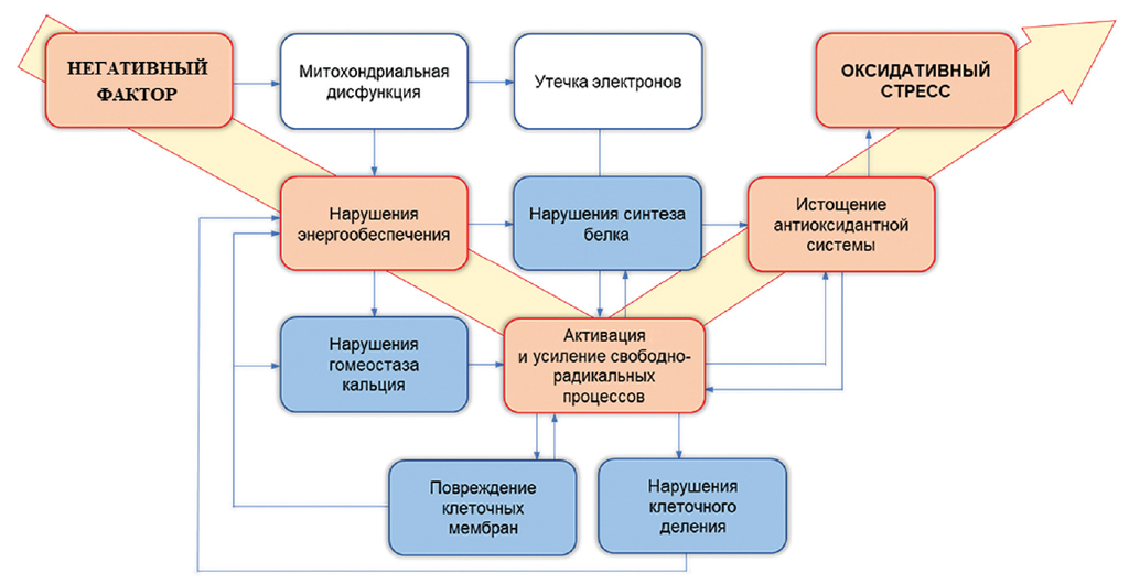 Действие негативных факторов различной природы может приводить к митохондриальной дисфункции, характеризующейся утечкой электронов из ЭТЦ митохондрий и нарушениями окислительного фосфорилирования. Увеличение АФК и других прооксидантов является причиной гиперактивации свободнорадикальных процессов, в том числе связанных с внутриклеточными нарушениями гомеостаза кальция. Повреждение клеточных мембран приводит к дальнейшим нарушениям и лавинообразному усилению свободнорадикальных процессов.