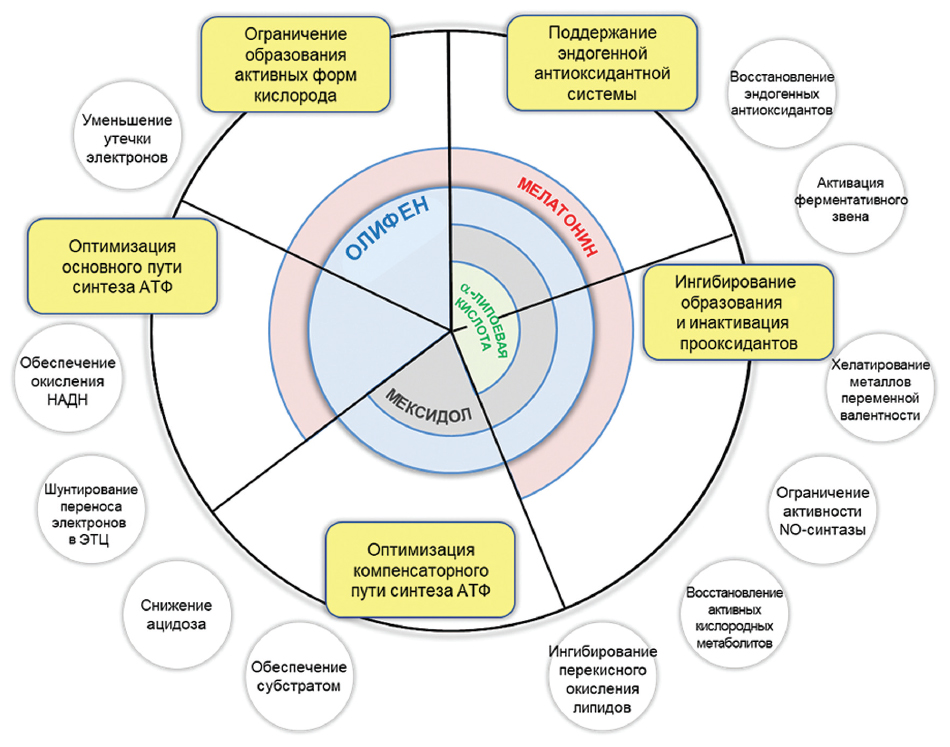 При этом, указанные препараты должны обладать полифункциональным действием – обеспечивать повышение эффективности утилизации кислорода в реакциях окислительного фосфорилирования, снижение выраженности свободнорадикальных и перекисных процессов в клетке, а также поддержание оптимального уровня эндогенной системы антиоксидантной защиты.