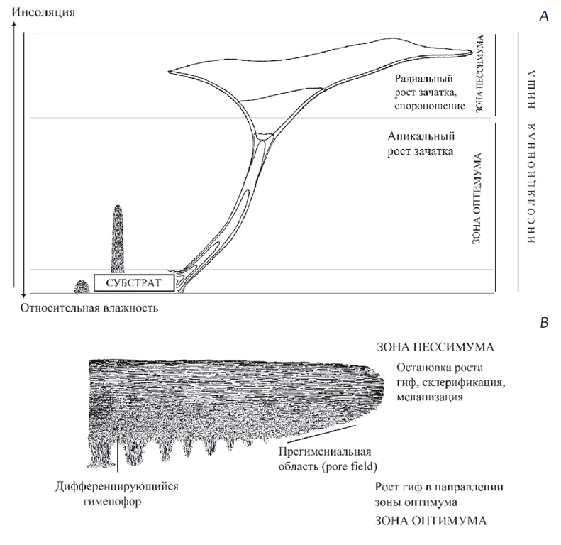 Рис. 1. Схематическое изображение развития базидиомы (A) и гименофора (B) Microporus xanthopus и интерпретация морфогенеза в свете представлений об инсоляционной нише [20]