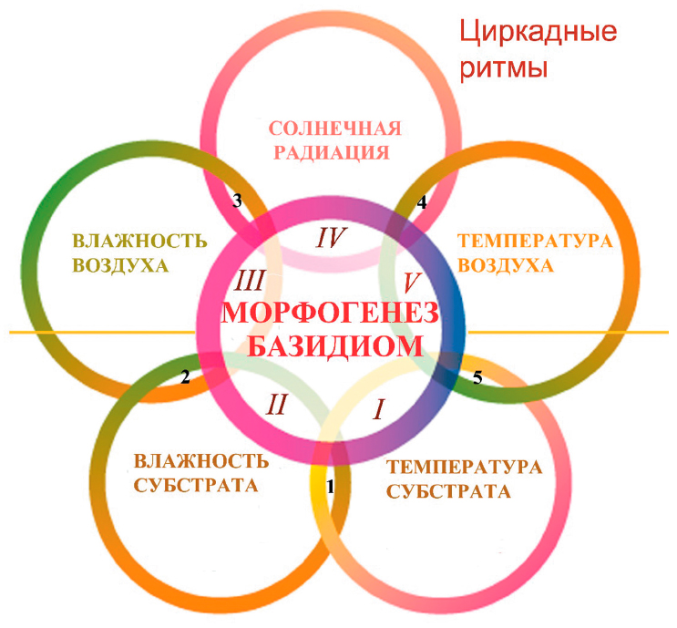 Рис. 2. Основные факторы, влияющие на морфогенез базидиом полипоровых грибов и эпифеномены их взаимодействия: 1 – гидротермический режим, 2 – интенсивность испарения, 3 – микроклимат, «инсоляционная ниша», 4 – суточные колебания, 5 – дневное прогревание субстрата. Морфогенетические эффекты: I – инициация примордиев, II – энергия экспансии воздушного мицелия, III – гигротропизмы (+/–), IV – фототропизм (+/–), V – гистогенез [20]