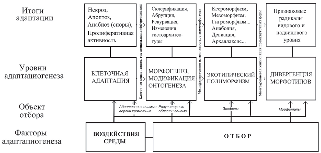 According to the concept proposed by I.V. Zmitrovich, the key determinants of adaptogenesis are an unstable environment and a set of “selection filters”. At the cell level, selection occurs according to adaptively significant variants of non-coding DNA, which serve as the basis for molecular pre-adaptation. At the level of tissue differentiation, histional differentiation plays an important role. Histion (a term by G.A. Savostyanov) is a kind of “production team” – a set of cells with differentiating functions and the main morphogenetic module at the tissue level of organization. Cell responses realized at this level underlie evolutionary changes in tissue architecture. At the level of the organism, differentiation of constitutional types, ecotypes, is of great adaptive significance. The ecotypic population is the material for speciation. At the supraspecific level, the subjects of adaptogenesis are morphotypes and body plans.