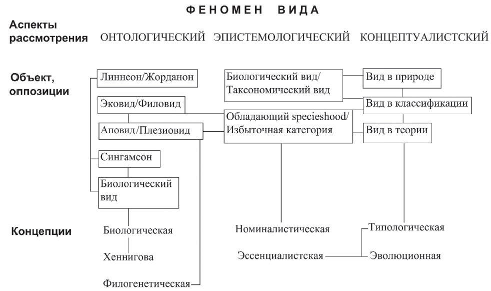 Рис. 5. Аспекты и концепции вида в систематике. Линии отражают взаимосвязь понятий. Корреляция понятий «эковид/филовид» (выделены двойной рамкой), все более успешная в связи с развитием методов молекулярной систематики и сравнительной геномики, дает важный материал для теории видообразования и адаптациогенеза [20]