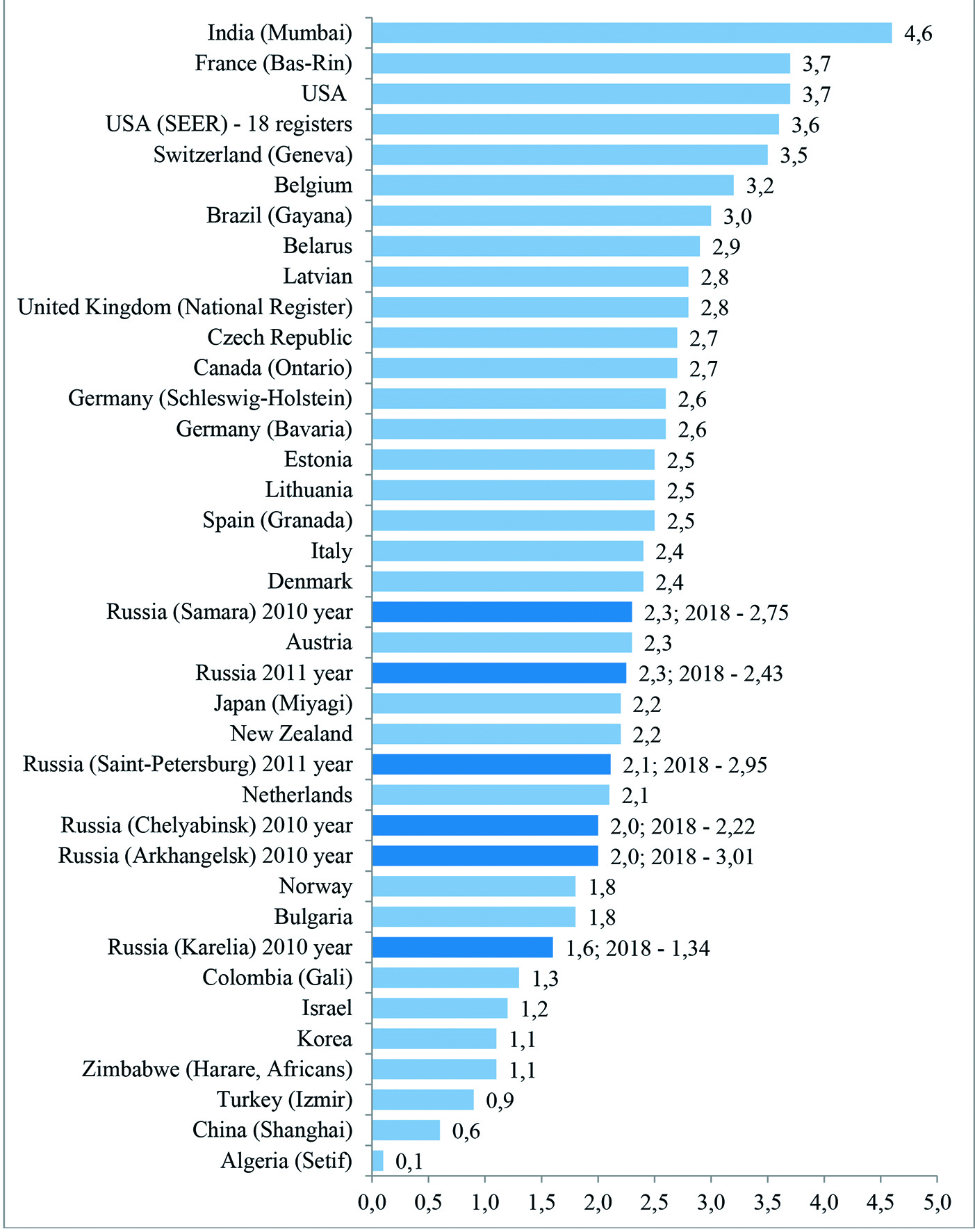 The other four were not accepted as there was non-compliance with the requirements of the state of the database and inability to pay the registration fee (150 euros). The latter indicates that for the territorial PCRs of Russia it is necessary to determine certain conditions for the possibility of financing work in the international projects and ensuring (according to the regulations in the orders of the Ministry of Health of Russia) a full-fledged staff of the PCRs, and also to carry out periodic analytical processing of the accumulated data. We hope that by the XII volume of IARC, the number of PRRs from Russia will increase. For example, all the administrative territories of the USA and the PCRs are represented in the CI5-X [10].