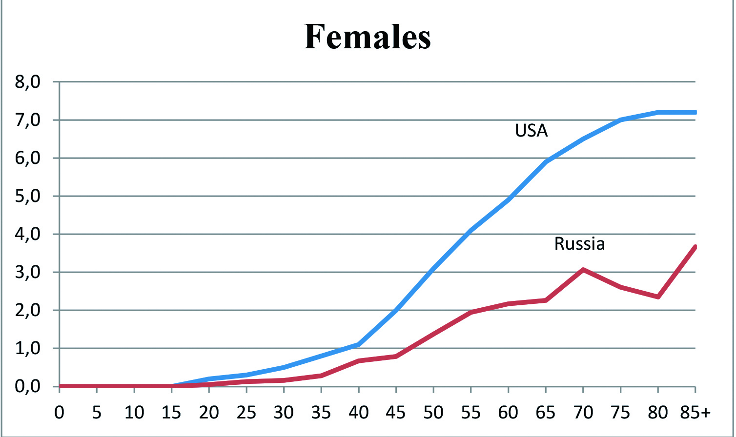 In the CI5 Vol. XI it was possible to consider age-specific incidence rate pattern. Figure 3 shows the comparative analysis of age-specific tongue cancer incidence rates in the United States and Russia. The observation period was averaged over five years (2008-2012) by 2010 for the US; the period of 2010 was considered for Russia [3, 14].