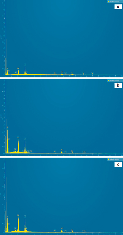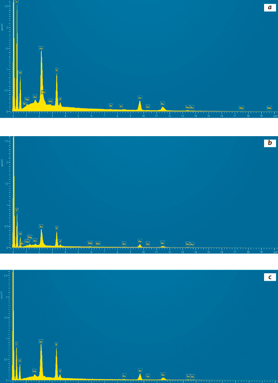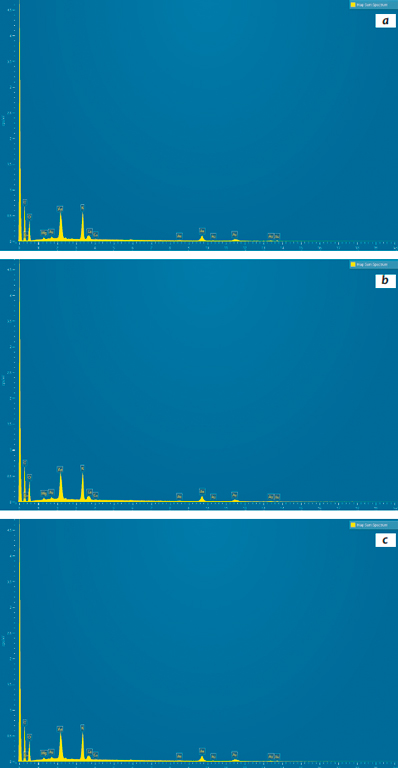 Рис. 5. Суммарные спектры элементного состава образца 2: а – участок 1, b – участок 2, c – участок 3