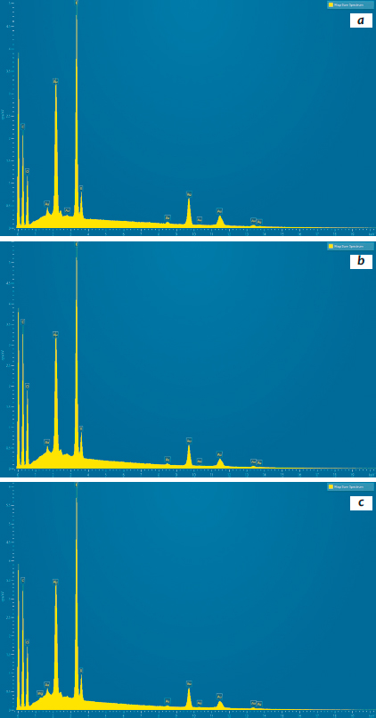 Рис. 7. Суммарные спектры элементного состава образца 3: а – участок 1, b – участок 2, c – участок 3