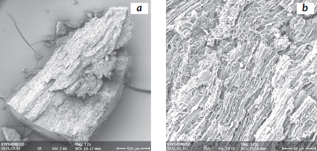 Рис. 10. SEM-изображения образца 5: а – частица образца 5 (участок 1), ×72; b – поверхность образца (участок 2) ×610