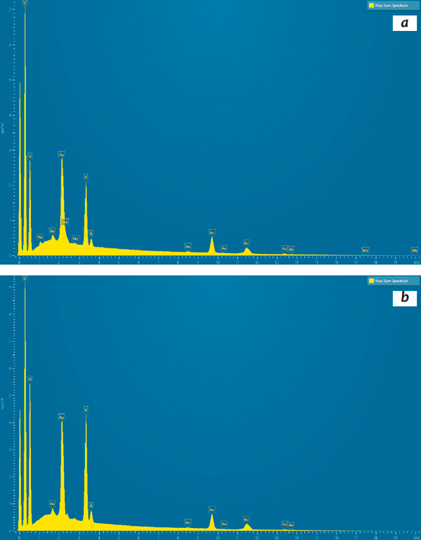 Рис. 11. Суммарные спектры элементного состава образца 5: а – участок 1, b – участок 2