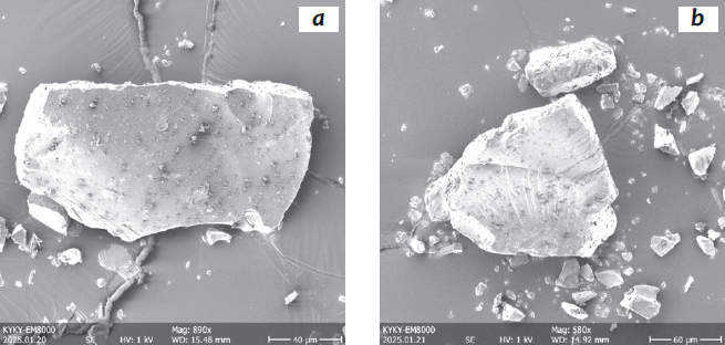 Рис. 12. SEM-изображение частиц исследуемого образца, (a – увеличение ×890, b – увеличение ×580, детектор SE, напряжение 1 кВ)