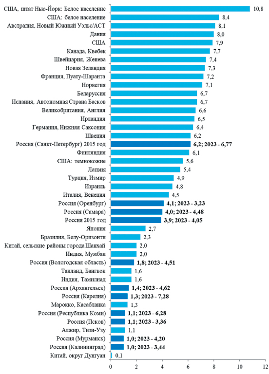 На ранговом распределении стандартизованные показатели заболеваемости лимфомами (ЛЛ) (код С91) в некоторых регионах мира представлены по данным последней опубликованной монографии МАИР «Рак на пяти континентах», том 12. В исследование также включены 9 первичных региональных регистров (ПРР) из России, из которых 7 относятся к Северо-Западному федеральному округу (СЗФО), а 2 – к Поволжскому федеральному округу (Поволжский ФО). Как показано на (рис. 1, 2), в предыдущих томах монографии МАИР (с VI по X) была представлена информация только по ПРР Санкт-Петербурга, тогда как в 12 томе представлены данные по всем территориям США [5].