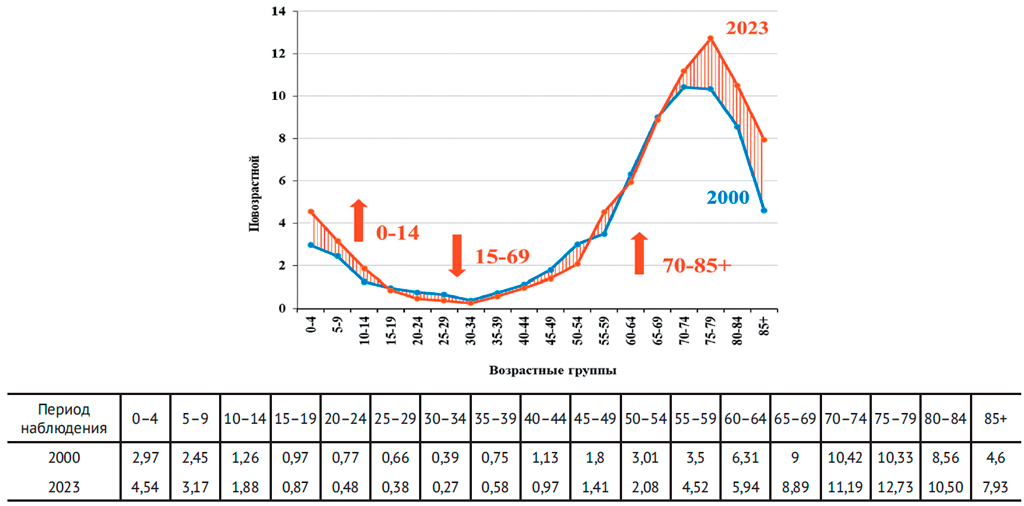 Fig. 5 + table. Dynamics of changes in age-related morbidity rates of the male population. Russia. 2000–2023 [7, 9]