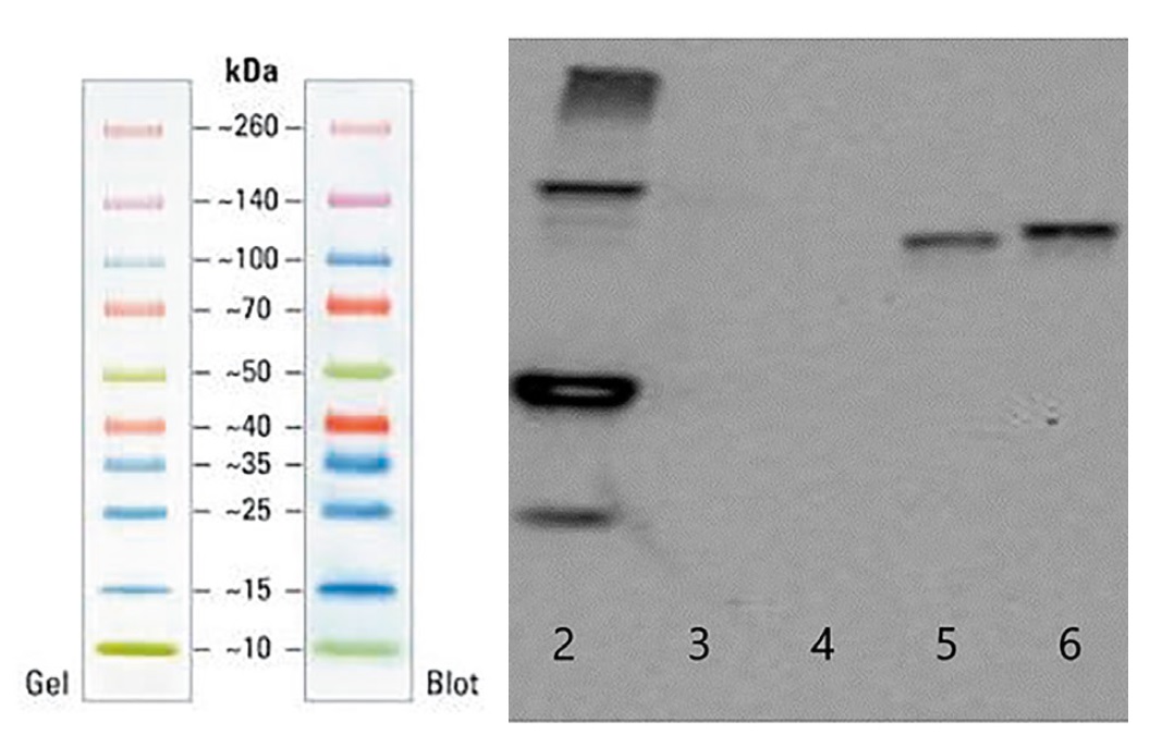 После проведения трансфекции из клеточных осадков был выделен белок, после чего поставлен Western Blot. По результату, представленному на рисунке 1, мы наблюдаем для контрольного белка c FLAG-tag яркий бэнд подходящего размера – 54,6 кДа (линия 2), что свидетельствует о специфичном связывании антител. Для белка SpCas9 мы не должны были наблюдать бэнд, так как этот белок не содержал FLAG-tag (3). Для белков DfCas9, DsCas9 (6 и 5 соответственно) наблюдали бэнды соответствующего размера, что свидетельствует об их экспрессии в клетках млекопитающих.