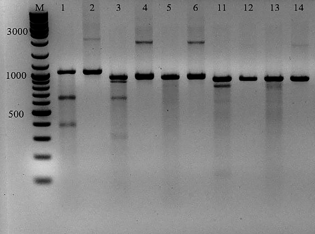 Рис. 3. Результаты электрофоретического анализа после обработки Т7 эндонуклеазой исследуемого образца (DsCas9), нумерация обозначает номер лунки из схемы аликвотирования образцов (табл. 7) / Fig. 3. Results of electrophoretic analysis after T7 endonuclease treatment of the test sample (DsCas9), the numbering indicates the number of the well from the aliquotation scheme of the samples (тable 7)