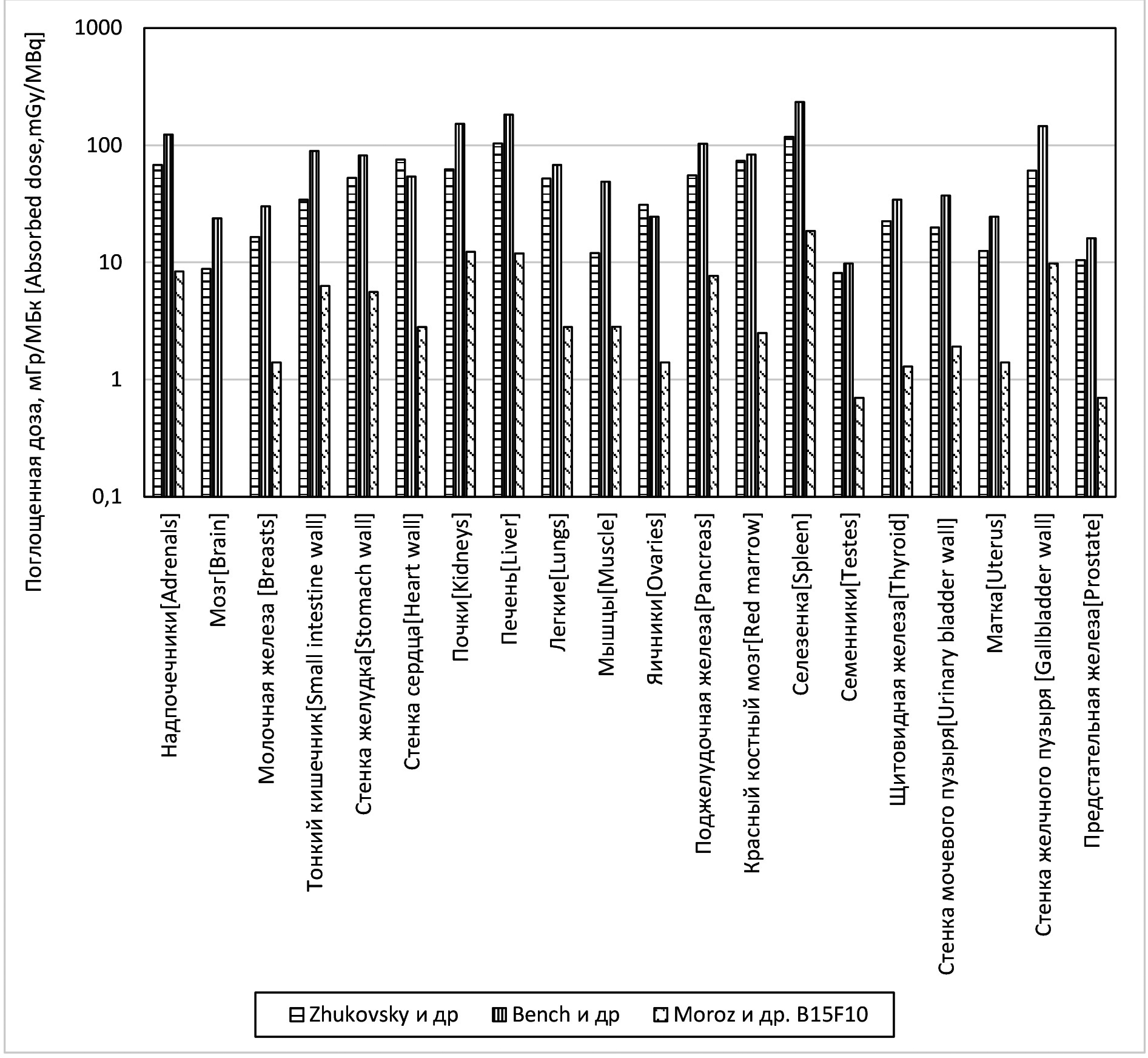 Рис. 2. Поглощенные дозы в органах и тканях пациентов при проведении диагностического исследования с 89Zr-трастазумабом (70 МБк), полученные в разных работах / Fig. 2. Absorbed doses in organs and tissues of patients during a diagnostic examination with 89Zr-trastazumab (70 MBq), obtained in different studies
