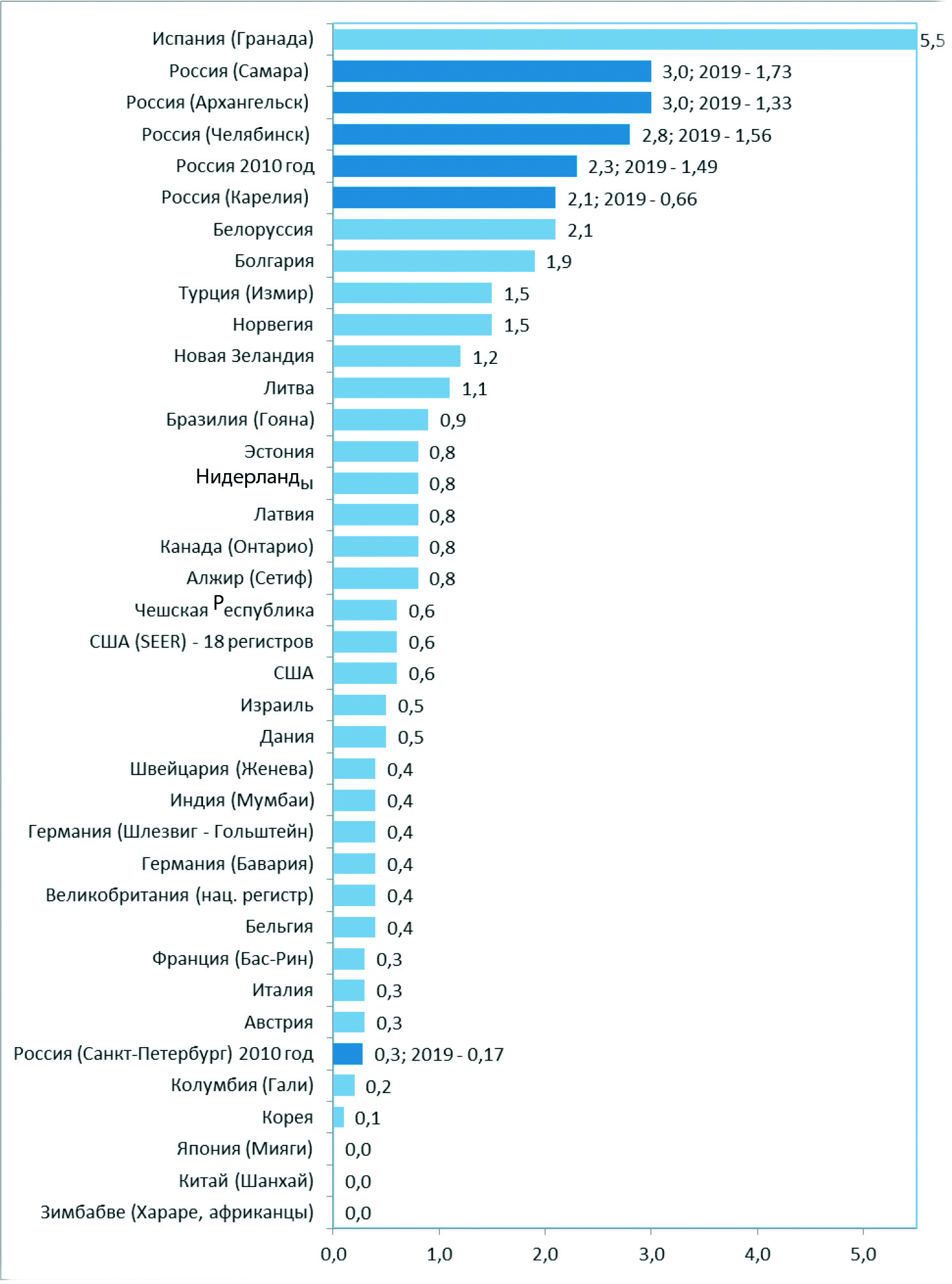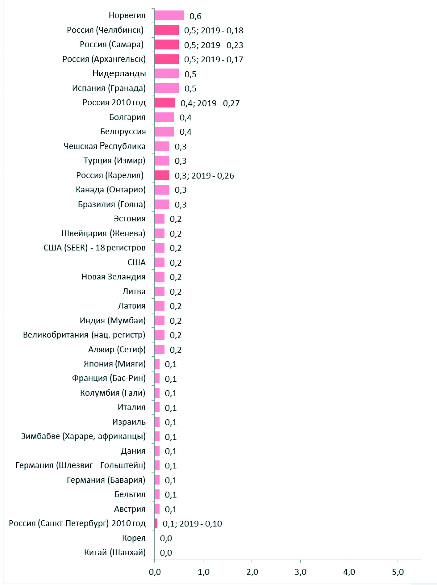 По последним опубликованным данным монографии МАИР «Рак на пяти континентах» том XI, в мире наивысший уровень стандартизованных показателей заболеваемости ЗНО губы (С00) отмечены среди мужского населения Испании (Гранада) – 5,5 0/0000, наименьшая в Колумбии (Гали) и Корее – 0,2. По материалам ряда ПРР за 5 лет (2008–2012) не зафиксировано ни одного случая заболевания среди мужского населения Китая (Шанхай) и Зимбабве (Хараре, африканцы). Среди женского населения наивысшие показатели заболеваемости зарегистрированы в Норвегии – 0,6 0/0000, Челябинской, Самарской и Архангельской области России – 0,5 0/0000, ни одного случая не учтено в Корее и Китае (Шанхай) (рис. 1, 2) [1–5].