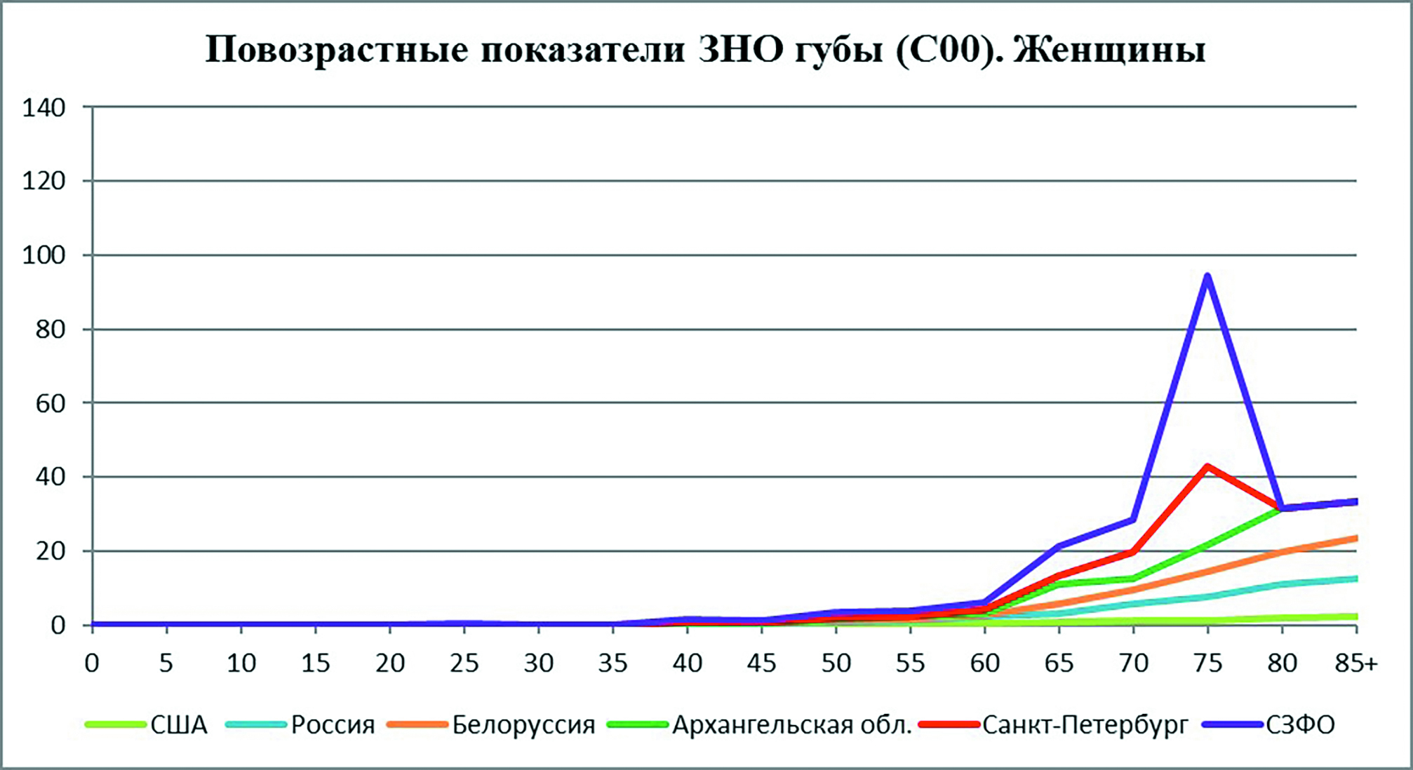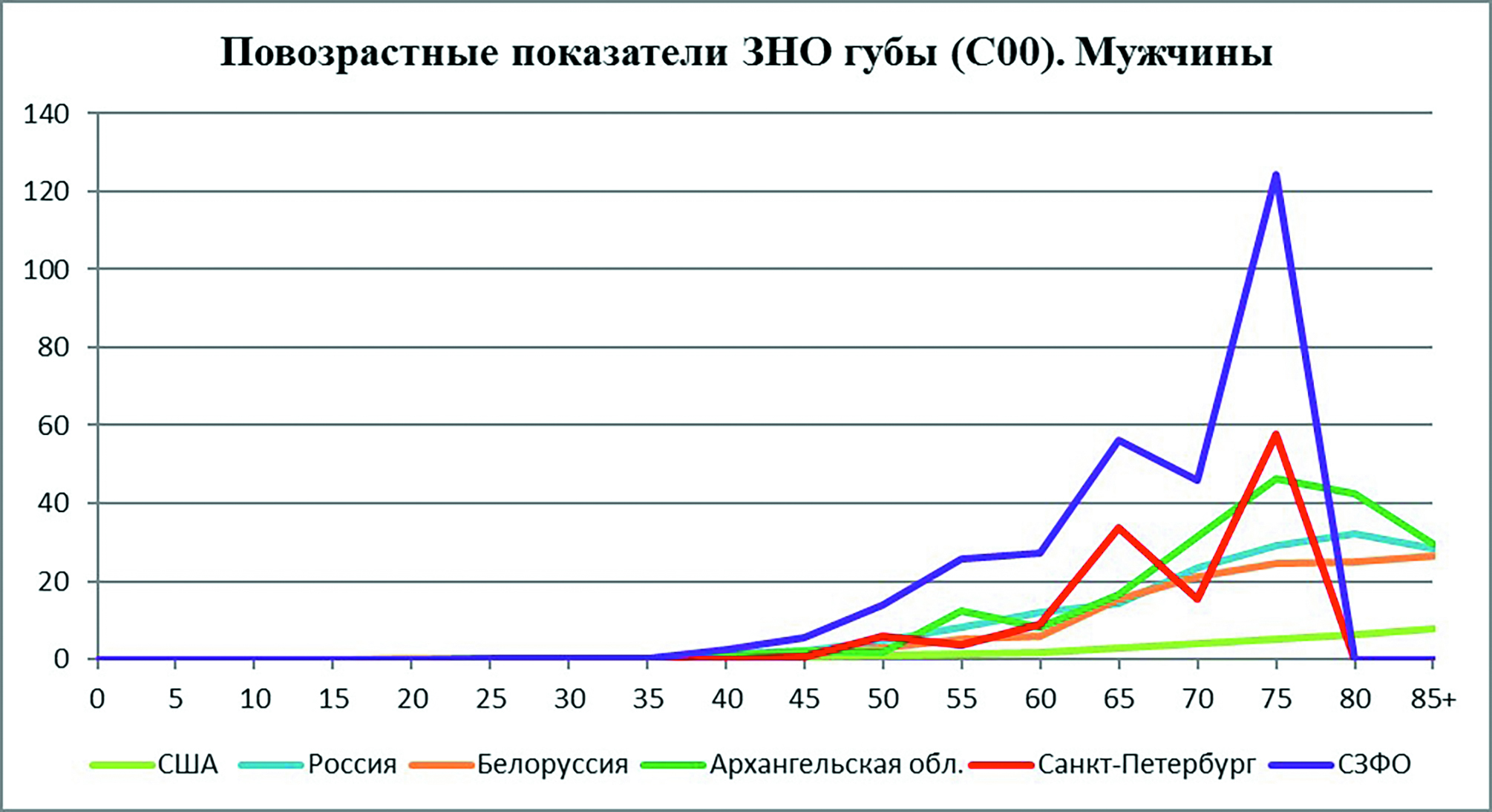 На рисунке 3 и 4 представлены величины повозрастных показателей заболеваемости ЗНО губы в некоторых странах, России и некоторых её административных территориях. ЗНО губы относится к локализациям опухолей, четко связанных с социальным уровнем страны, уровнем противораковой пропаганды. Если по многим другим локализациям опухолей уровни повозрастных показателей ЗНО в США намного выше среднероссийских, то относительно ЗНО губы мы видим другую картину, особенно в СЗФО, где повозрастные показатели заболеваемости, особенно в старших возрастных группах, многократно выше, чем в США, что в первую очередь может быть связано с курением и гигиеной полости рта.