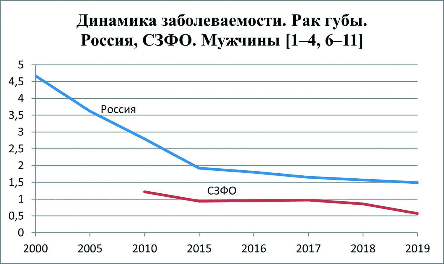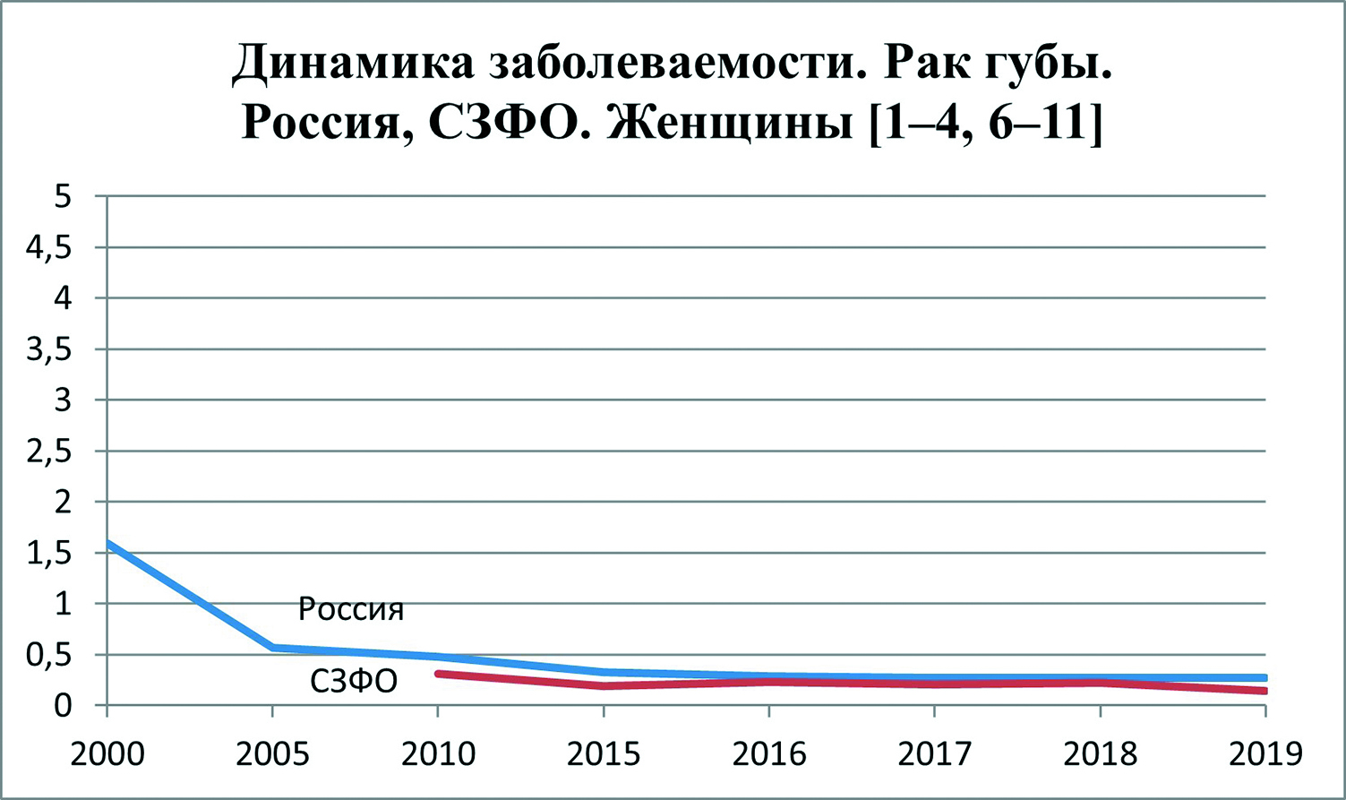 Таким образом, проведенное исследование выявило высокий уровень заболеваемости населения в России и СЗФО ЗНО губы на фоне показателей по экономически развитым странам, однако уровень заболеваемости постепенно снижается.