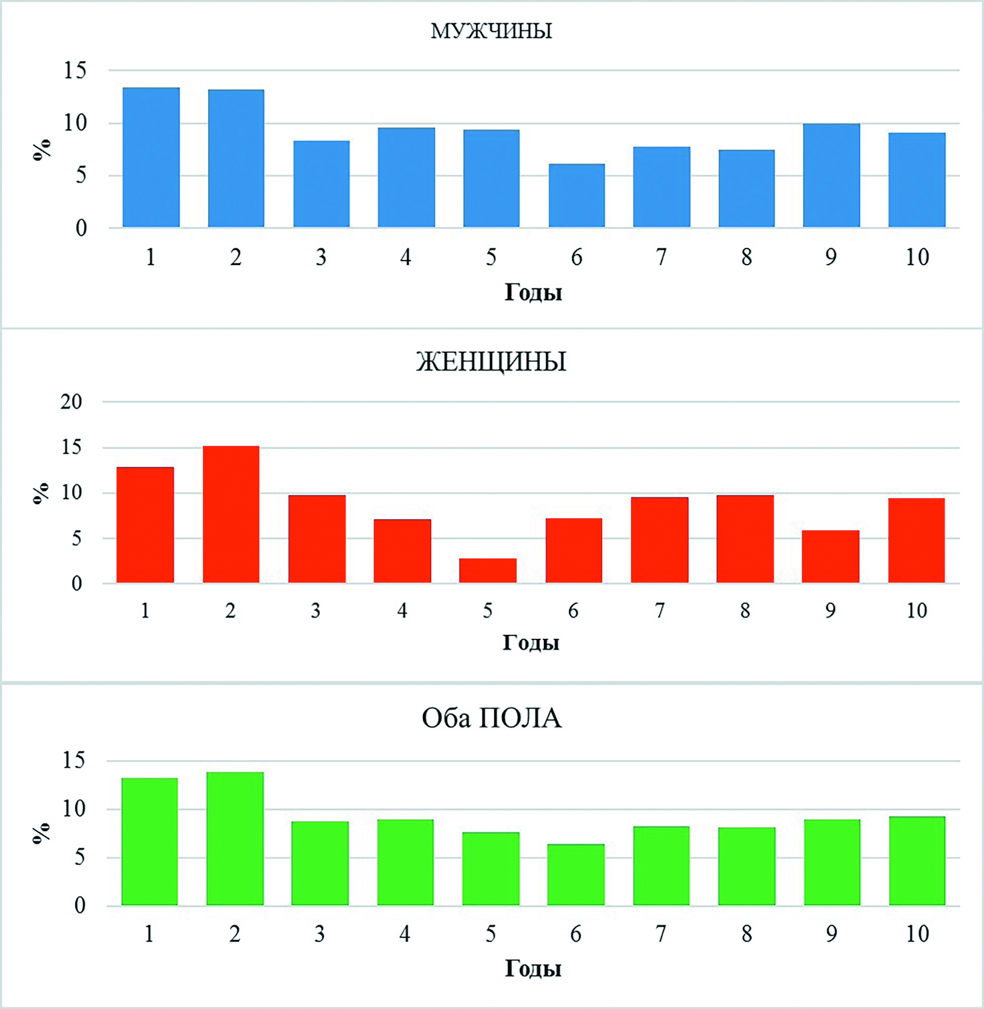 Летальность мужчин и женщин на каждом году наблюдения не имела существенных статистических различий. Вместе с тем, отмечен всплеск летальности у мужчин на четвертом, седьмом и девятом году наблюдения, у женщин – на втором, шестом, седьмом и десятом, что требует проведения фундаментальных исследований в поисках причин всплеска летальности.