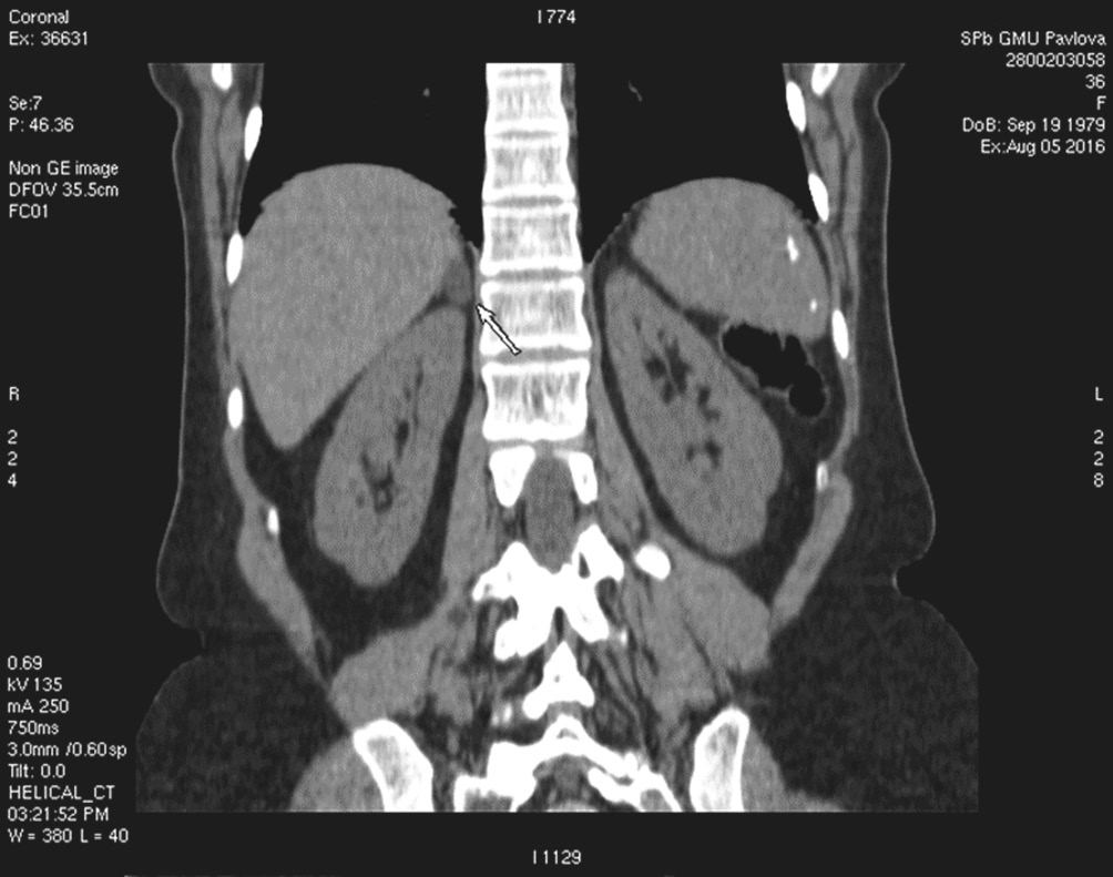 Для оценки состояния надпочечников, а также для дифференциальной диагностики различных форм ПГА 05.08.2016 пациентке была выполнена компьютерная томография органов брюшной полости и забрюшинного пространства с контрастированием (контраст вводился перорально и внутривенно). Было выявлено образование в медиальной ножке правого надпочечника (см. рисунок).