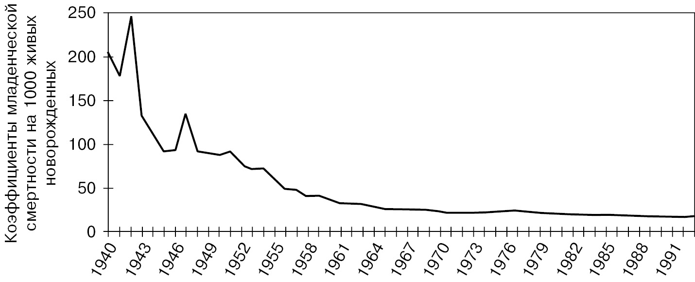 Challenges. Across the span of the 20th century the major population-decimating epidemics, famines (at least in developed countries) and world wars subsided. Major advances also occurred in environmental health (such as clean water, mostly adequate sewage and waste disposal, and food hygiene). These had significant positive impacts upon the general health and wellbeing of national populations in the West and other developed countries, and led to concomitant changes in terms of population increases and overall demographical profiles. As infant mortality and overall mortality rates fell, life expectancy increased and the numbers of vulnerable and older people increased. These trends placed greater demands upon health and social care services. To a large extent these trends were mirrored in the Russian Federation, although with some important deviations. As indicated in Figure 1 below, the general direction from the time of the Great Patriotic War (World War 2) until 1991, just before the ending of the USSR and inception of the Russian Federation, was a largely downward trend in Infant Mortality Rates (IMRs) [1].