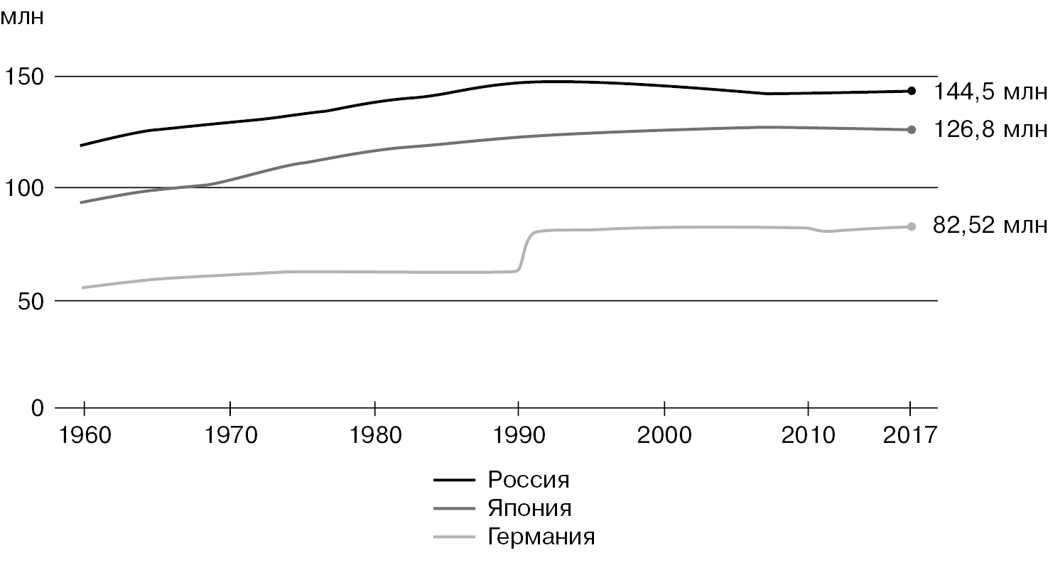Fig. 2. Population dynamics: Russia, Japan and Germany (1960–2017) [3]