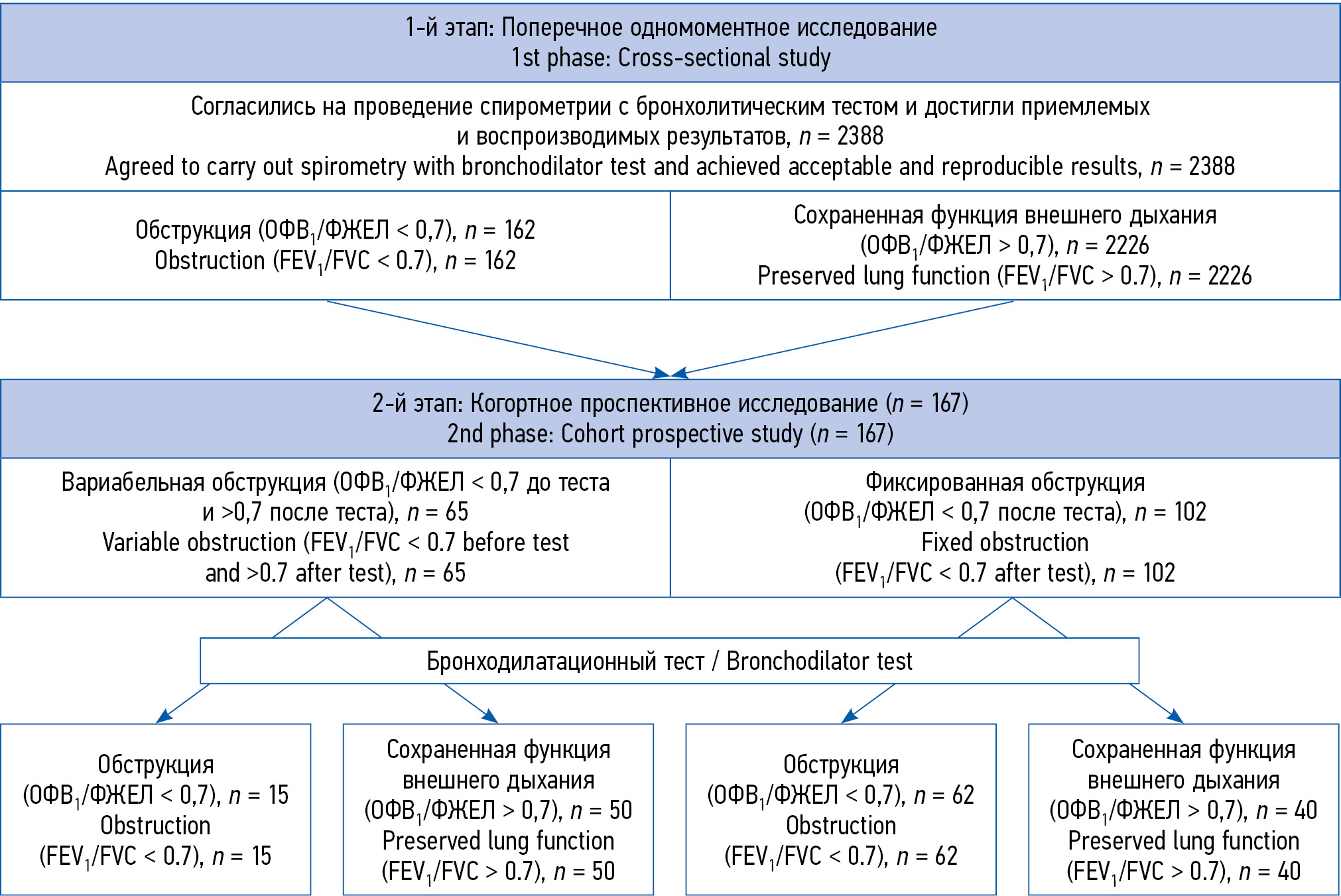 Исследование РЕСПЕКТ (RESPECT, RESearch on the PrEvalence and the diagnosis of COPD and its Tobacco-related аetiology — распространенность и диагностика ХОБЛ, а также ее этиология, связанная с курением) [10] проведено в Санкт-Петербурге и Архангельске среди лиц 35–70 лет, прикрепленных к 15 городским поликлиникам в рамках обязательного медицинского страхования. Дизайн исследования включал 2 этапа: 1) поперечное одномоментное (популяционное) исследование случайной выборки респондентов; 2) когортное проспективное исследование лиц, отобранных по результатам исходной спирометрии, с фиксированной или вариабельной обструкцией (рис. 1). У всех респондентов регистрировали демографические данные, анамнез курения (статус курения, индекс пачка лет), факторы риска обструктивных нарушений (загрязнение воздуха внутри и вне помещений, в том числе на рабочем месте, а также пассивное курение), оценивали хронические респираторные симптомы (кашель, мокроту, одышку) и выполняли спирометрию с бронходилатационной пробой.