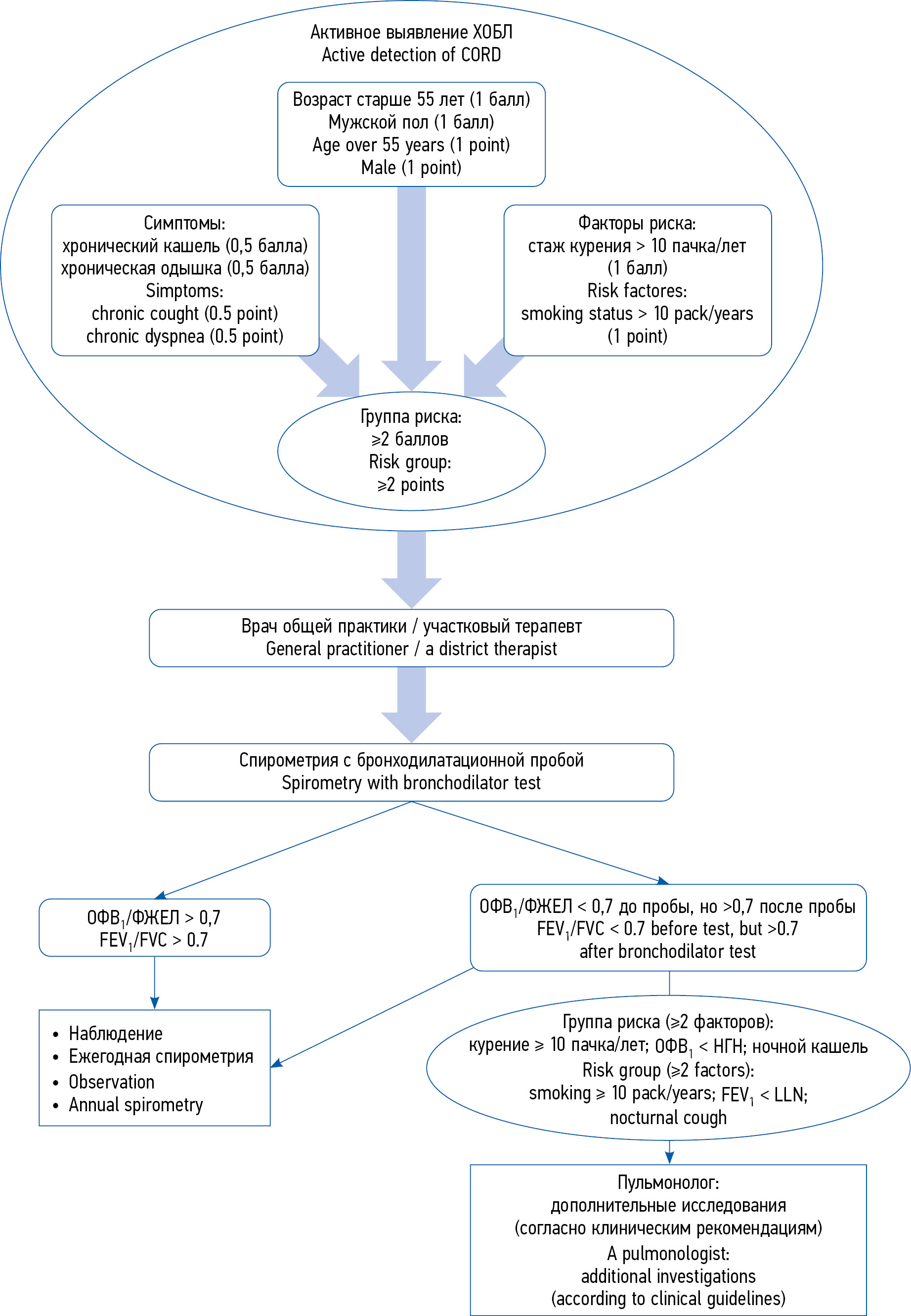 Диагноз «ХОБЛ» необходимо подозревать у всех лиц с хроническими респираторными симптомами (кашлем, мокротой и одышкой) и факторами риска, такими как активное и пассивное курение, воздействие факторов загрязнения окружающей среды или профессиональных вредностей, и подтверждать при спирометрии с бронходилатационной пробой [1, 3]. Сложность диагностики ХОБЛ обусловлена низкой прогностической значимостью опросников, причем роль спирометрии как скринингового инструмента в общей популяции у асимптомных лиц без факторов риска остается противоречивой [4]. В то же время у пациентов с хроническим бронхитом и аналогичными факторами риска и симптомами спирометрия не включена в качестве диагностического инструмента в диспансерное наблюдение (согласно нормативным документам).