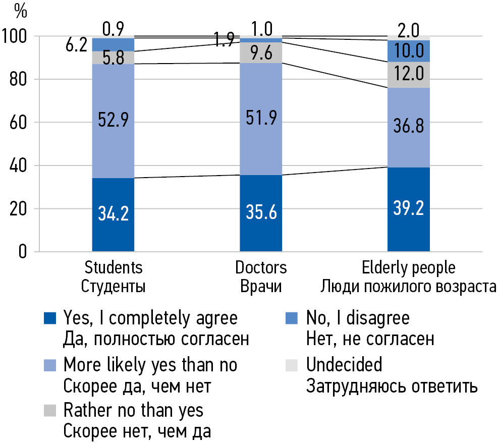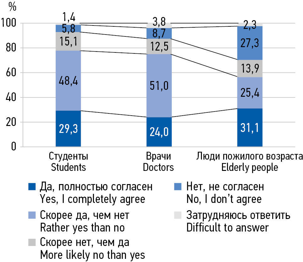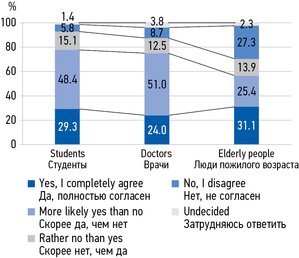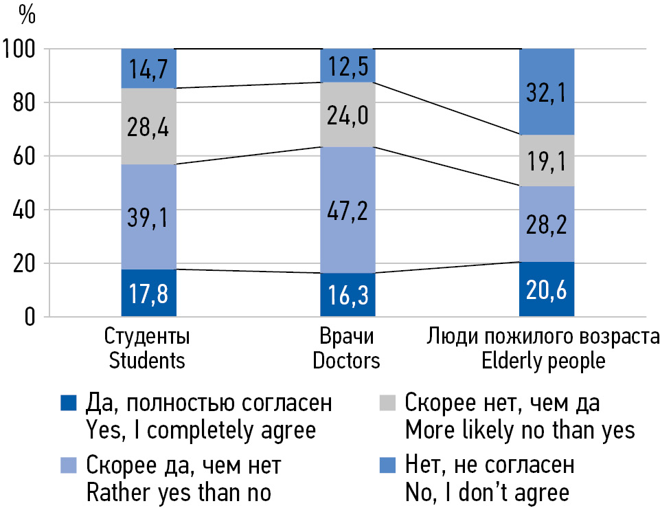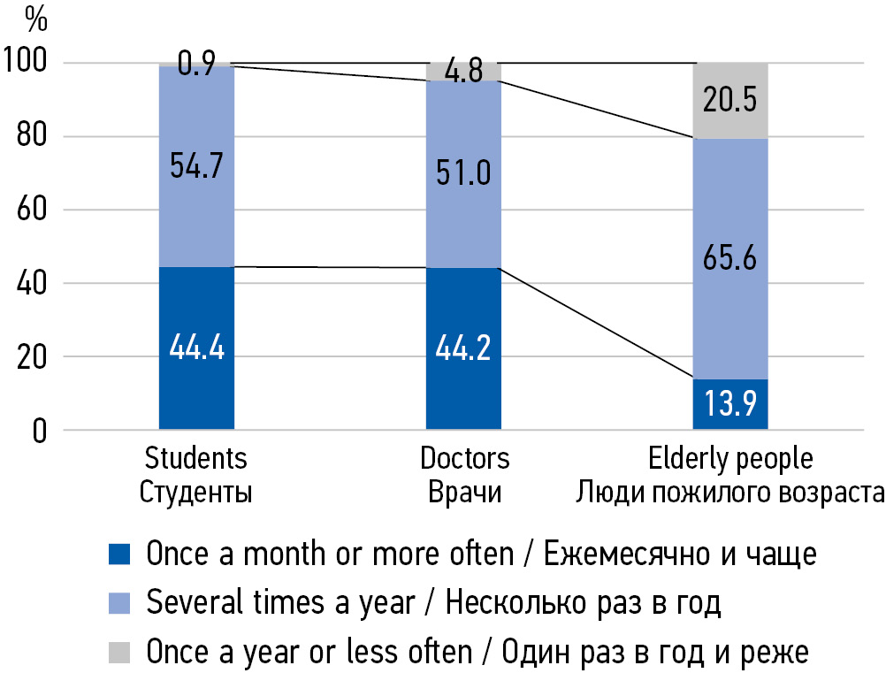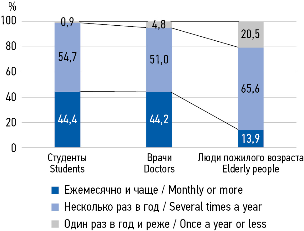 MATERIALS AND METHODS: In the period from 2018 to 2022, 538 people aged 20 to 75 were interviewed in 3 subgroups: 1) senior students of a medical university of medical specialties, 2) young and middle-aged primary health care doctors, 3) elderly people.
