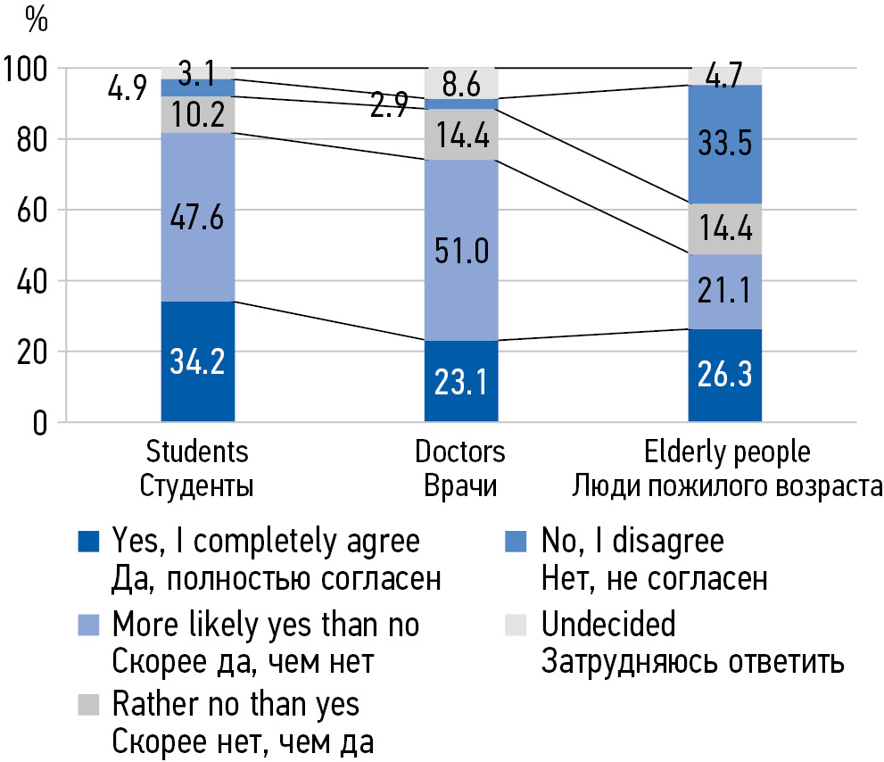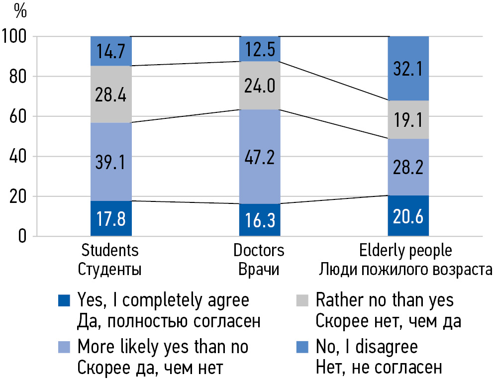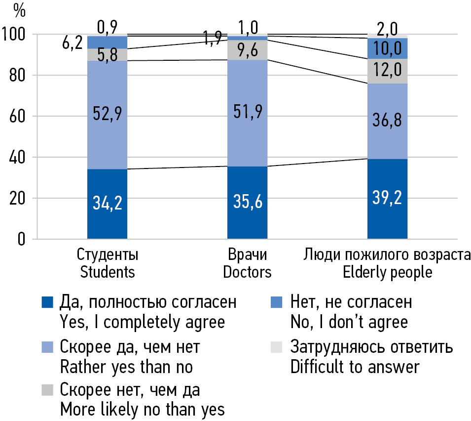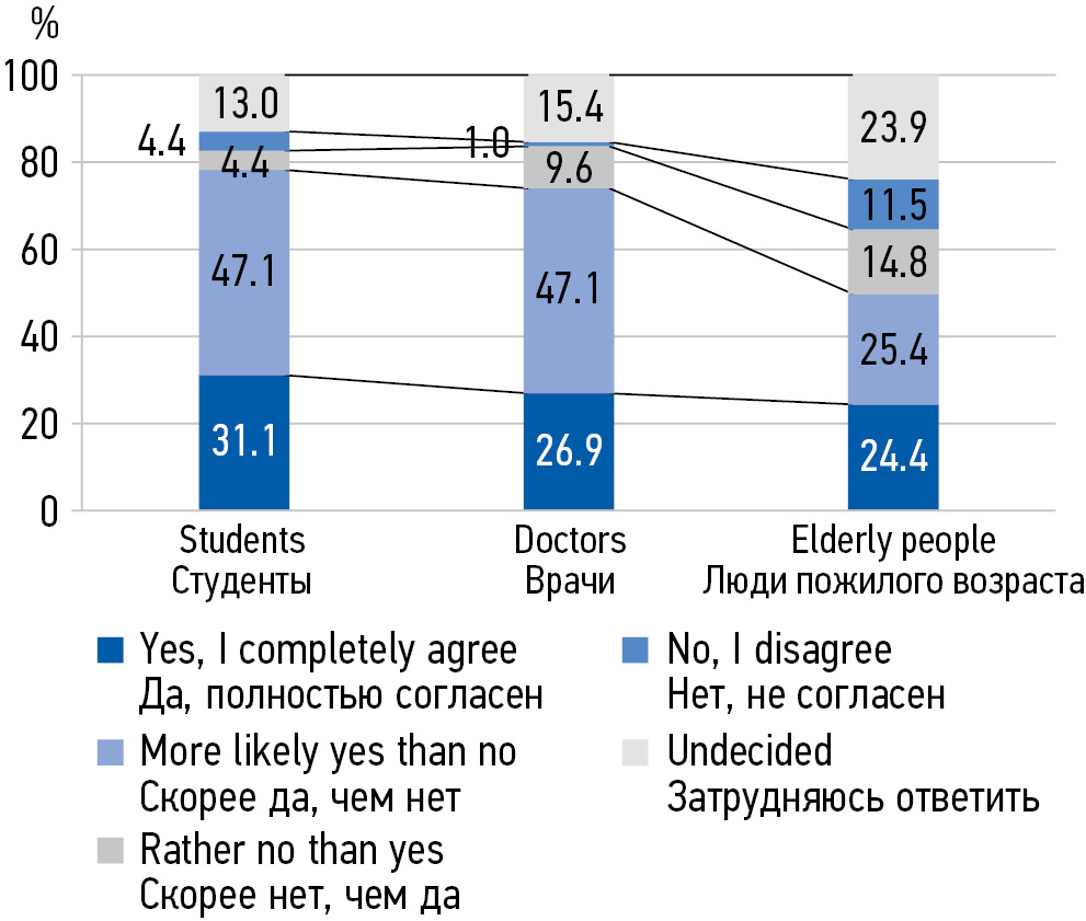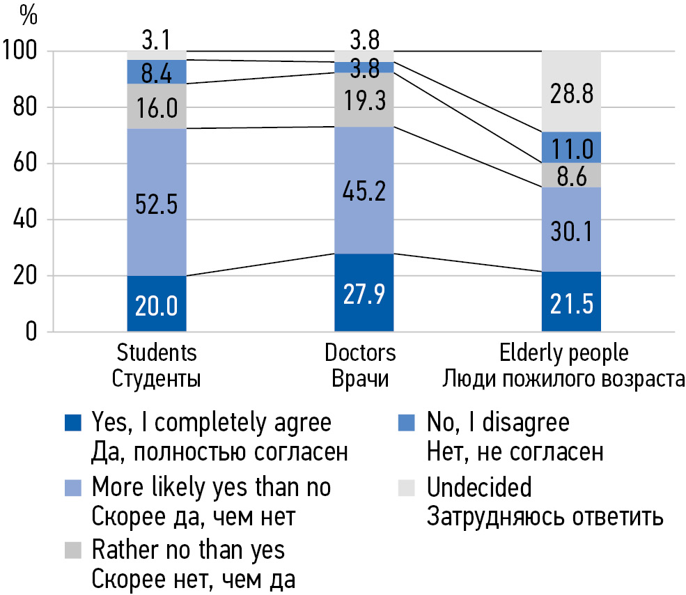 MATERIALS AND METHODS: In the period from 2018 to 2022, 538 people aged 20 to 75 were interviewed in 3 subgroups: 1) senior students of a medical university of medical specialties, 2) young and middle-aged primary health care doctors, 3) elderly people.