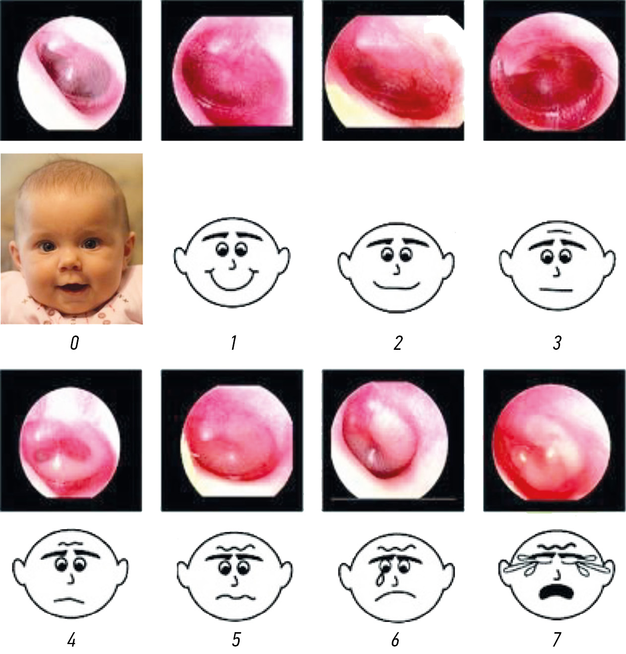 Рисунок. Корреляция между показателем по визуальной шкале боли и выраженностью воспаления на примере острого среднего отита [9 c изменениями]. 0 — норма, отоскопическая картина не изменена, ребенок здоров; 1 — норма, отоскопия показывает норму или небольшой выпот, обнаруженный случайно или сохраненный после отита; 2 — отит, ребенок может беспокоиться, но легко отвлекается, играет, спит, отоскопические признаки гиперемии без выпота; 3 — ребенок беспокоится, чешет ухо, может отвлечься, особенно на новую игрушку и интересную книгу, играет, отоскопия показывает гиперемию, прозрачный выпот с границей воздух – жидкость; 4 — беспокойство, возможна простреливающая боль в ухе при глотании, отоскопия показывает эритему, мутный выпот с границей жидкость – воздух, возможны пузырьки воздуха в жидкости, нет выбухания барабанной перепонки; 5 — явное неблагополучие, боли, лихорадка, отоскопия показывает эритему, мутный выпот без границы жидкость – воздух, нет выбухания барабанной перепонки; 6 — тяжелое состояние, лихорадка, боль выраженная, ребенок не спит и не ест, выраженные эритема и выбухание барабанной перепонки; 7 — состояние неотложное, боль усиливается, ребенок не контактен, отоскопия показывает выбухание барабанной перепонки, возможны буллы / Figure. Correlation between the visual scale of pain and the severity of inflammation in the example of acute otitis media [9 with modifications]. 0, norm, the otoscopic picture is not changed, the child is healthy; 1, norm, otoscopically shows the norm or a small effusion, it can be detected incidentally or persist after otitis media; 2, otitis, the child may be anxious but easily distracted, plays, sleeping, otoscopically shows hyperemia without effusion; 3, the child is worried, scratching his ear, somebody can distract, especially with a new toy, an interesting book, the child plays, otoscopically shows hyperemia, transparent effusion with an air/fluid border; 4, anxiety, there may be shooting pain in the ear when swallowing, otoscopically shows erythema, cloudy effusion, liquid/air interface, possible air bubbles in the liquid, there is no bulging of the eardrum; 5, obvious trouble, pain, fever, otoscopically shows erythema, cloudy effusion, no fluid/air boundary, there is no bulging of the eardrum; 6, the child’s condition is serious, fever, the pain is pronounced, doesn’t sleep, doesn’t eat, severe erythema of the tympanic membrane, its swelling; 7, the condition is urgent, the pain intensifies, the child is not contacted, otoscopically shows bulging of the tympanic membrane, bullae are possible