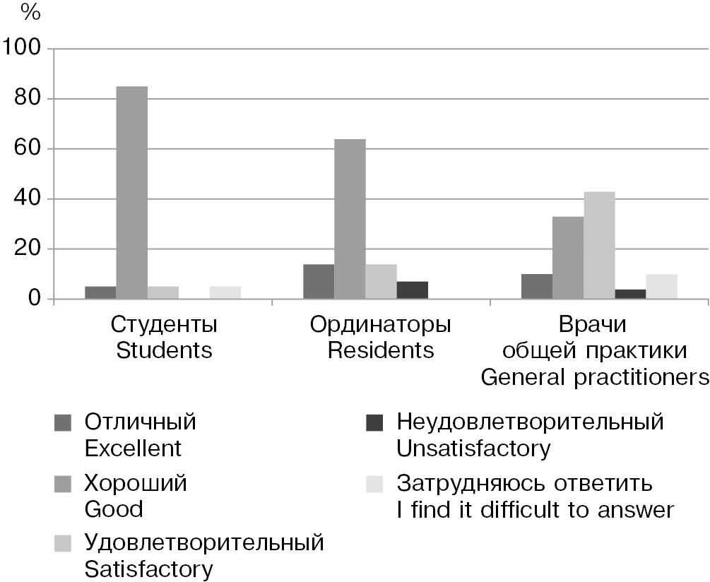 В одномоментном исследовании приняли участие 57 человек из числа обучающихся на кафедре на тот период времени: 22 студента, 14 ординаторов и 21 врач общей практики. Средний возраст опрошенных составил 32 года.