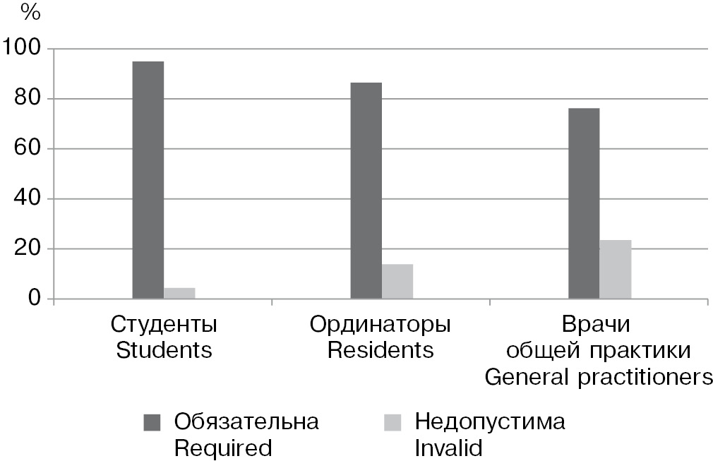 На вопрос об отношении к необходимости вакцинации большинство опрошенных (95,5 % студентов, 85,7 % ординаторов и 76,2 % врачей) ответили, что она крайне необходима (обязательна), часть опрошенных выбрали вариант ответа «допустима (возможна, но необязательна)» (p > 0,05) (рис. 2).