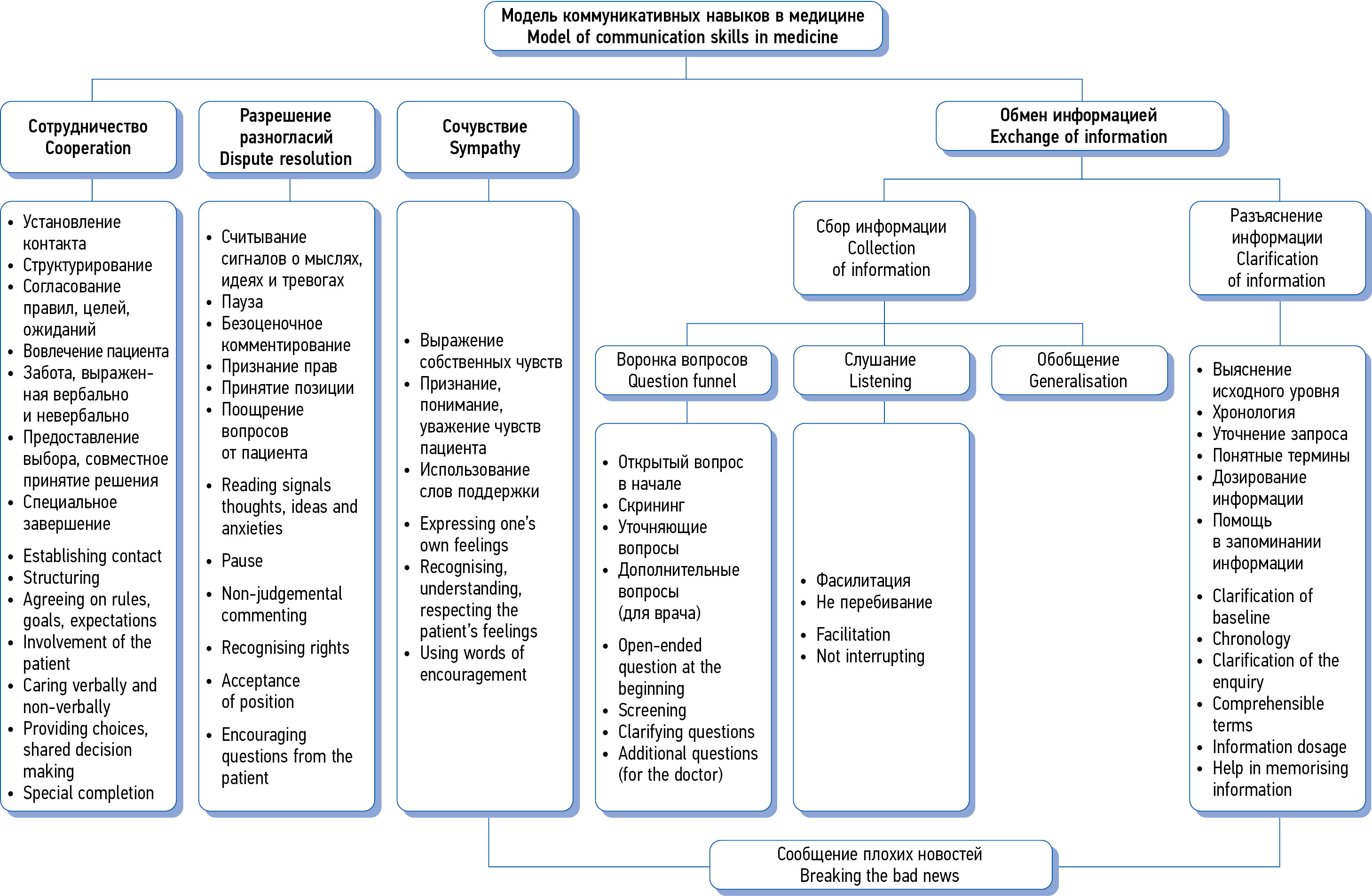 Самым объемным и важным блоком в сфере общения в медицине являются навыки обмена информацией с пациентами. К ним относятся навыки сбора информации (умение задавать вопросы, слушание, обобщение), а также навыки донесения (разъяснения) информации (уточнение запроса, дозирование информации, помощь в запоминании и др.). Частным случаем разъяснения информации является ситуация сообщения плохих новостей в сочетании проявлением сочувствия.