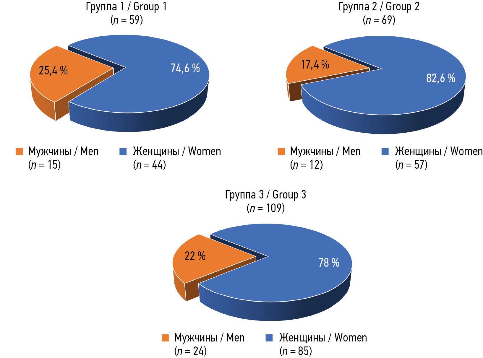 Статистический анализ проводили с использованием прикладных программ Microsoft Excel 2013 (Microsoft, США), Statistica 12.0 (StatSoft Inc., США) и Statgraphics Centurion XVIII версия 18.2.14 (Statgraphics Technologies Inc., Англия). Для оценки достоверности различий показателей в трех группах сравнения применяли дисперсионный (ANOVA) анализ (при нормальном распределении показателей) и критерий Краскела – Уоллиса. Для анализа качественных показателей строили частотные таблицы и для сравнения групп использовали критерий χ² Пирсона. Корреляционный анализ проводили с определением рангового коэффициента корреляции Спирмена (r) при нормальном распределении значений показателя и уровня значимости (ρ) — для показателей, не соответствующих нормальному распределению. Различия считали значимыми при p < 0,05.